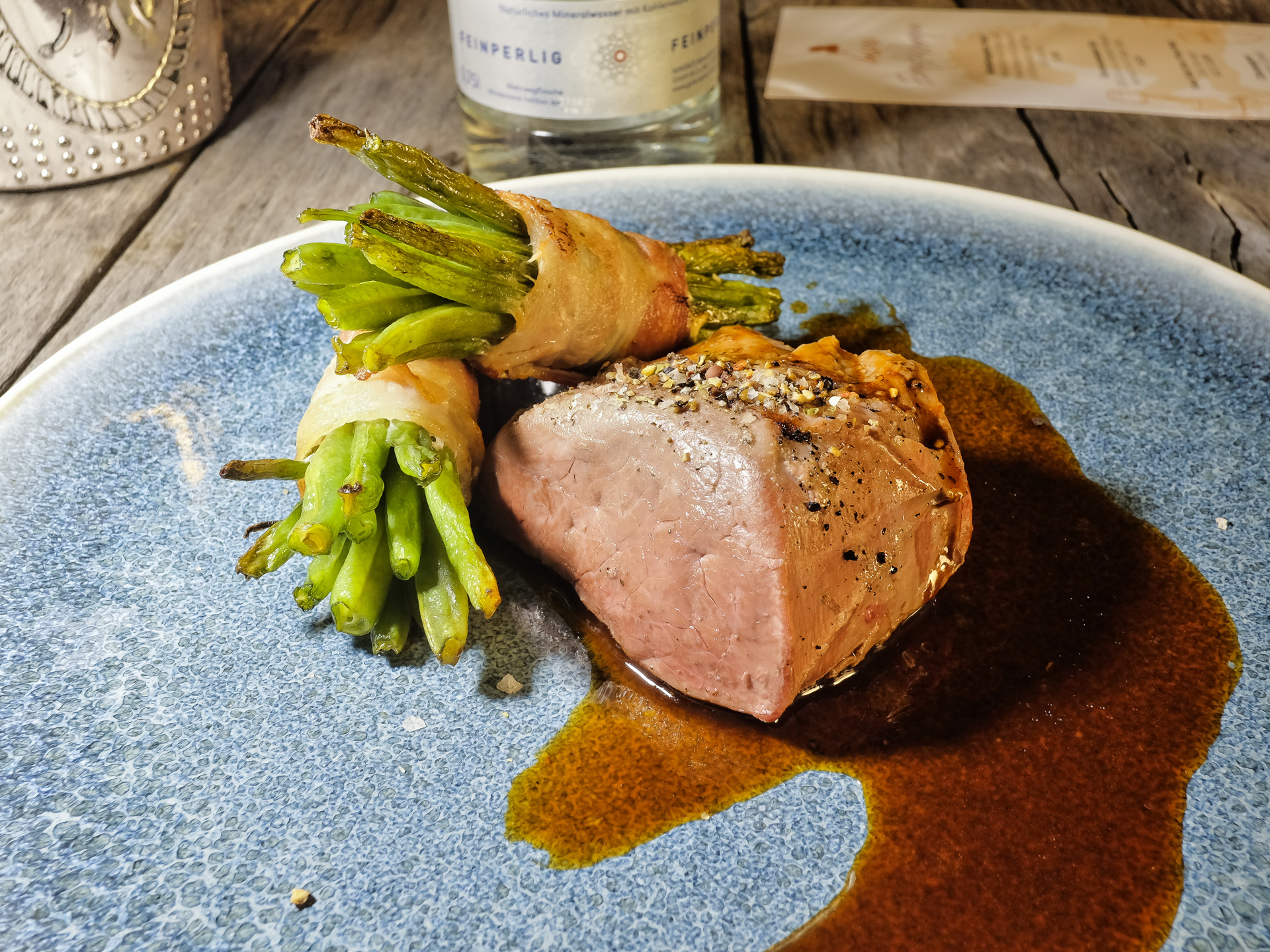 Das dry aged Rinder Filet war zart und hatte ein feines Aroma. Dazu gab es grüne Bohnen im Speckmantel. Sehr lecker, die Zubereitung der Bohnen mit dem Speck nahmen ihnen aber etwas Knackigkeit.