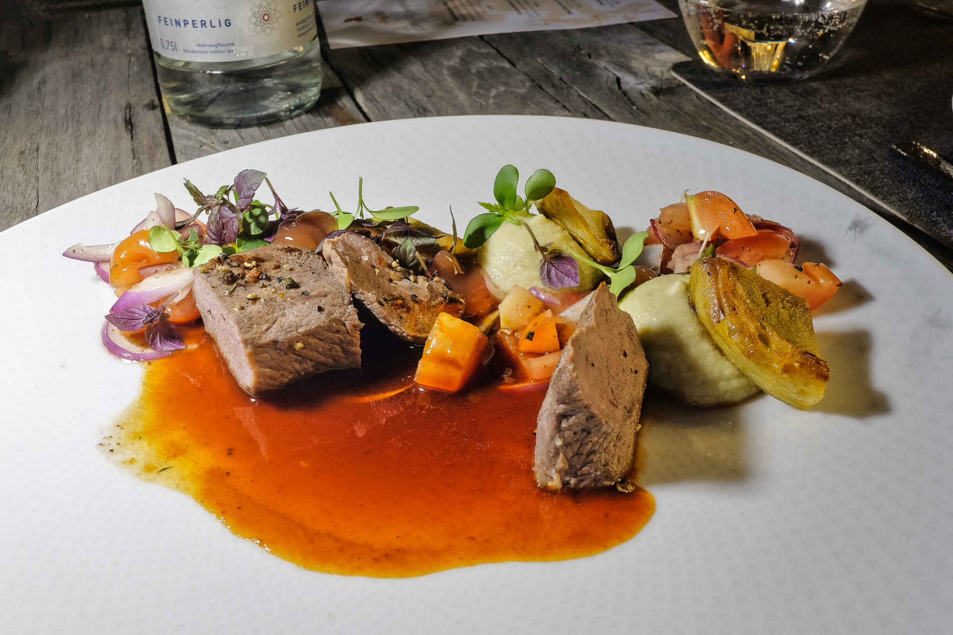 Das Raviolo war mit Wildfleisch gefüllt, der Teig war aber recht dick und die Füllung war trotz feinem Aroma etwas trocken und faserig. Dazu gab es eine fruchtige Preiselbeer Sauce mit feiner Säure und eine aromatische Sauce mit Dijon Senf. Das passte geschmacklich irgendwie nicht zusammen, gerade noch sehr lecker.