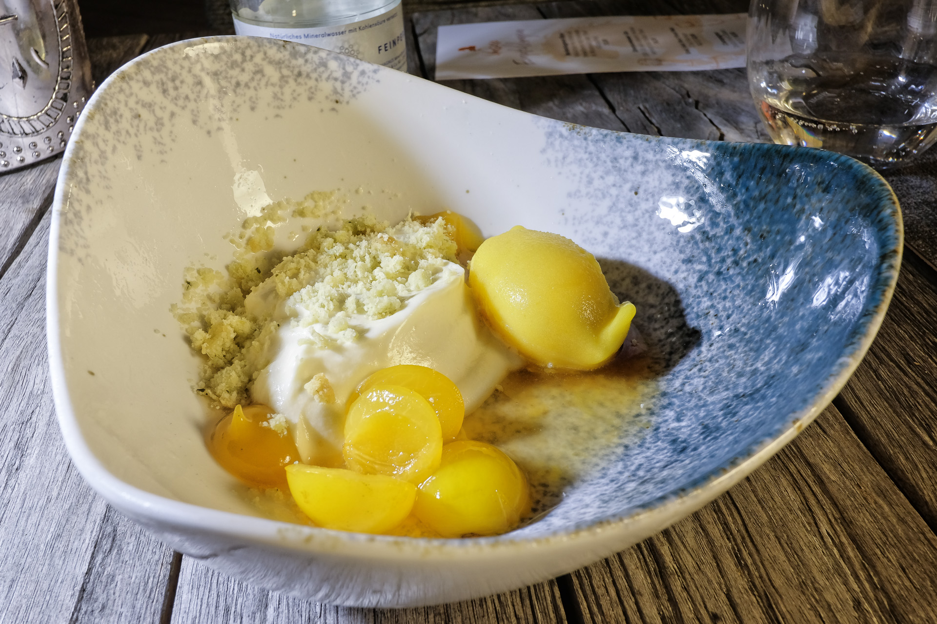 Als Dessert gab es eine Cheesecake Creme mit einem aromatischen Orangen Sorbet (Klasse), Mirabellen Kompott und Mürbeteig Streusel. Sehr lecker.