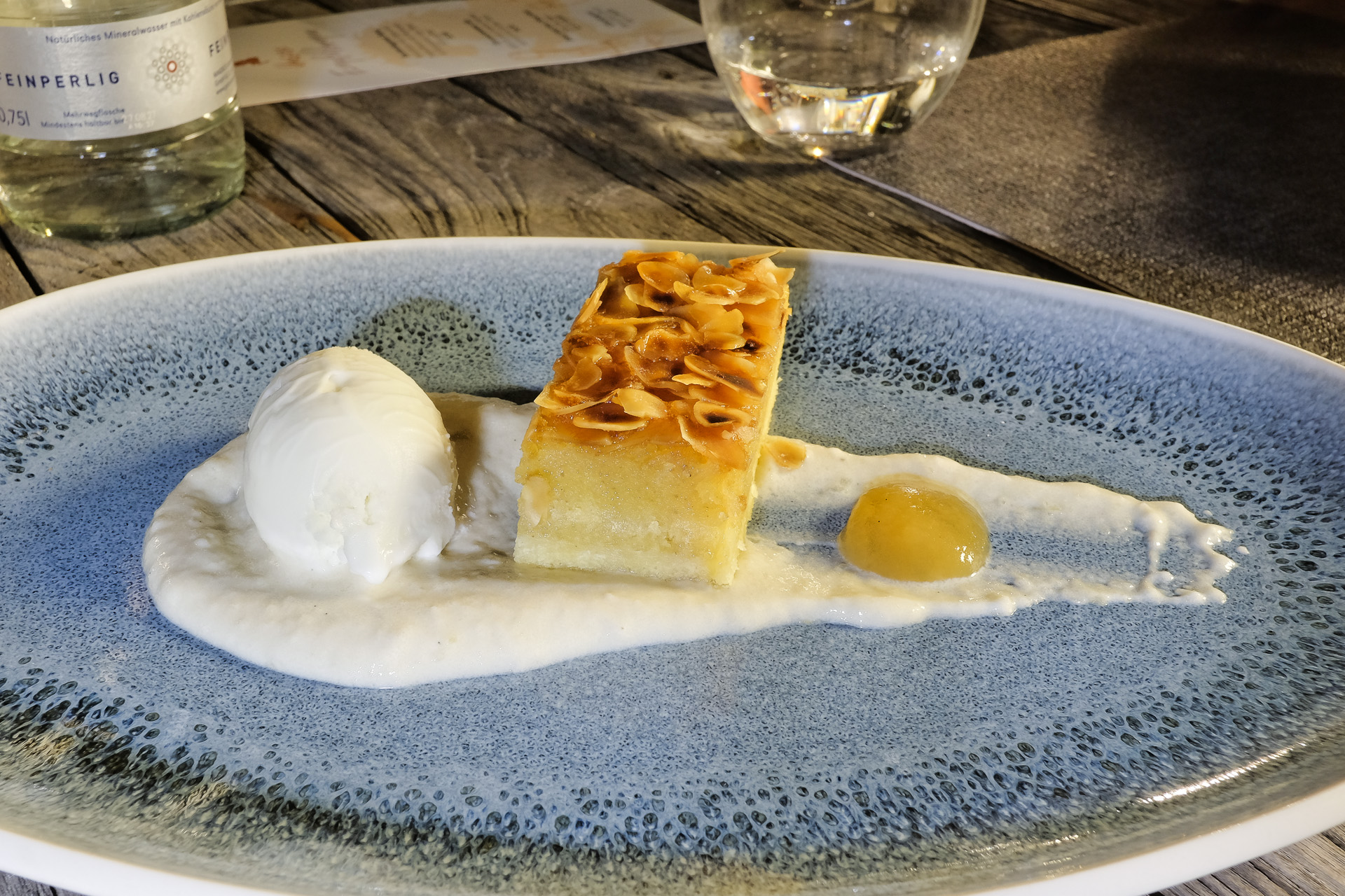 Als Dessert gab es einen saftigen spanischen Mandel Kuchen (Tarta de Santiago ?) mit feinem Aroma. Dazu gab es ein zart cremiges Dickmilch Eis mit fein säuerlichem Aroma, eine Mandelcreme und etwas Apfelmus. Calvados ist mir nicht aufgefallen. Sehr lecker.