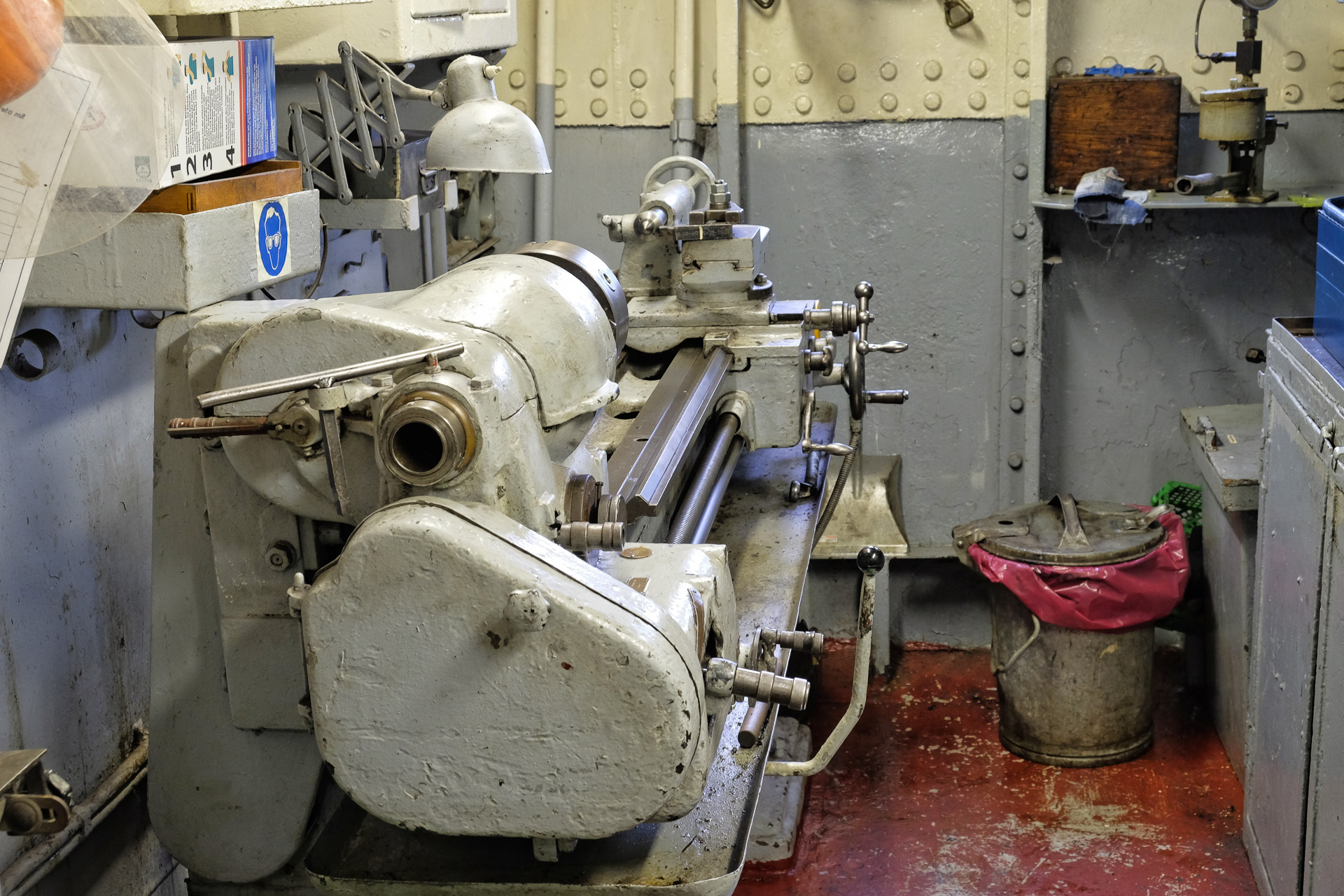 Im Maschinenraum gibt es auch eine kleine Werkstatt mit einer Drehbank.