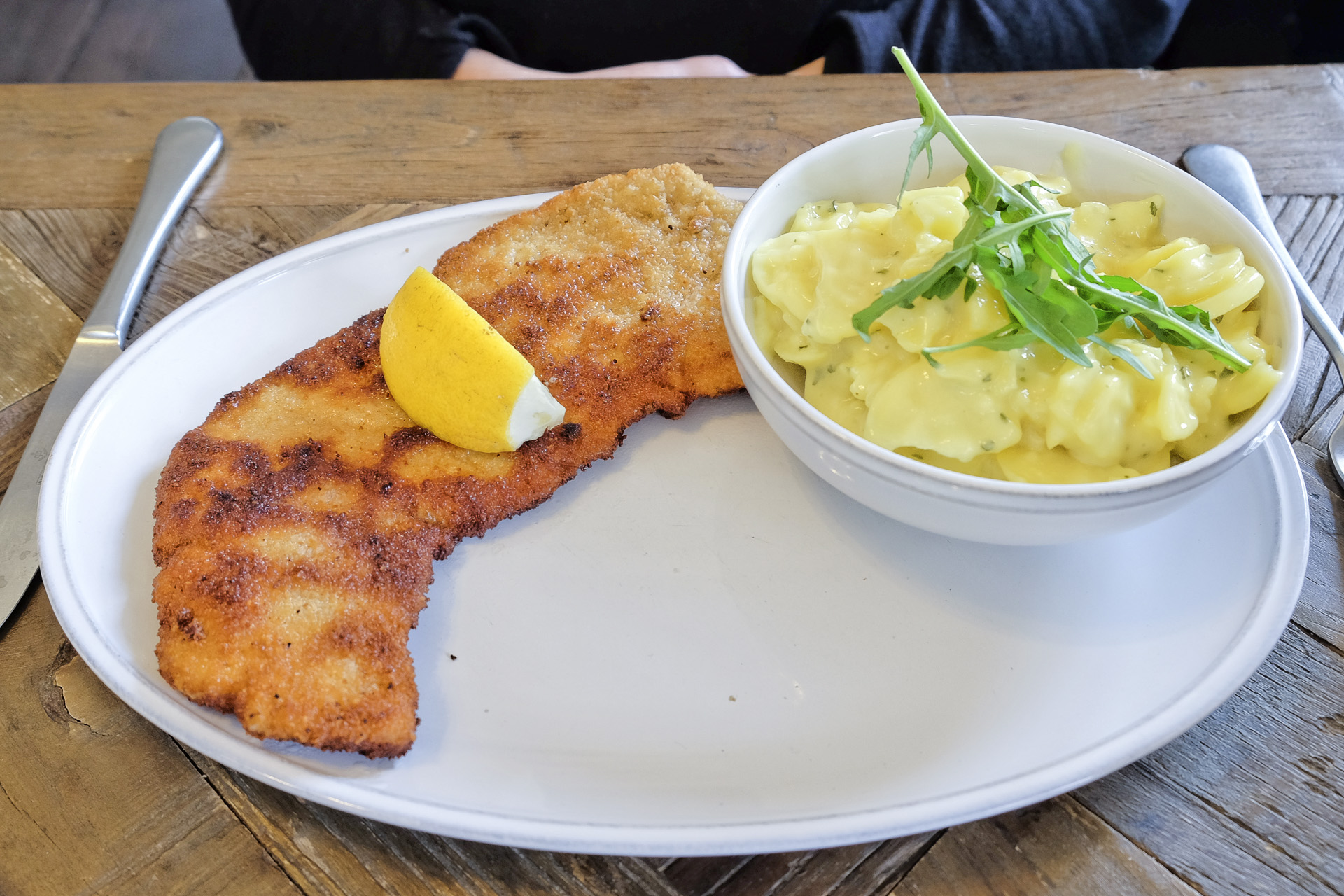Das Schnitzel vom Schwein war zart und hatte ein feines Aroma, die Panade war schön kross. Dazu gab es einen Kartoffelsalat mit fein säuerlichem Aroma und etwas Rucola. Sehr lecker.