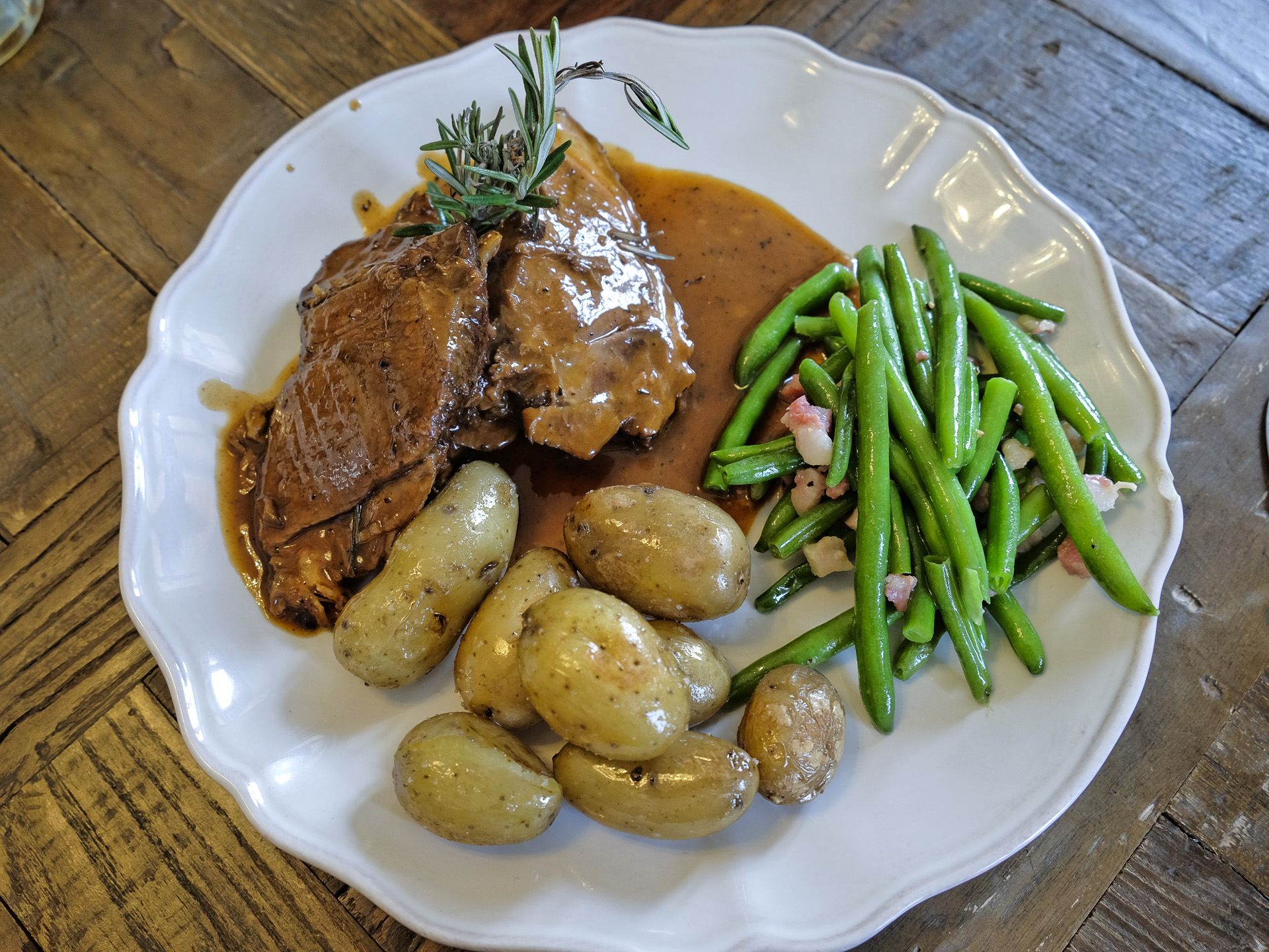 mit Speckbohnen, Rosmarinkartoffeln & Thymian Jus