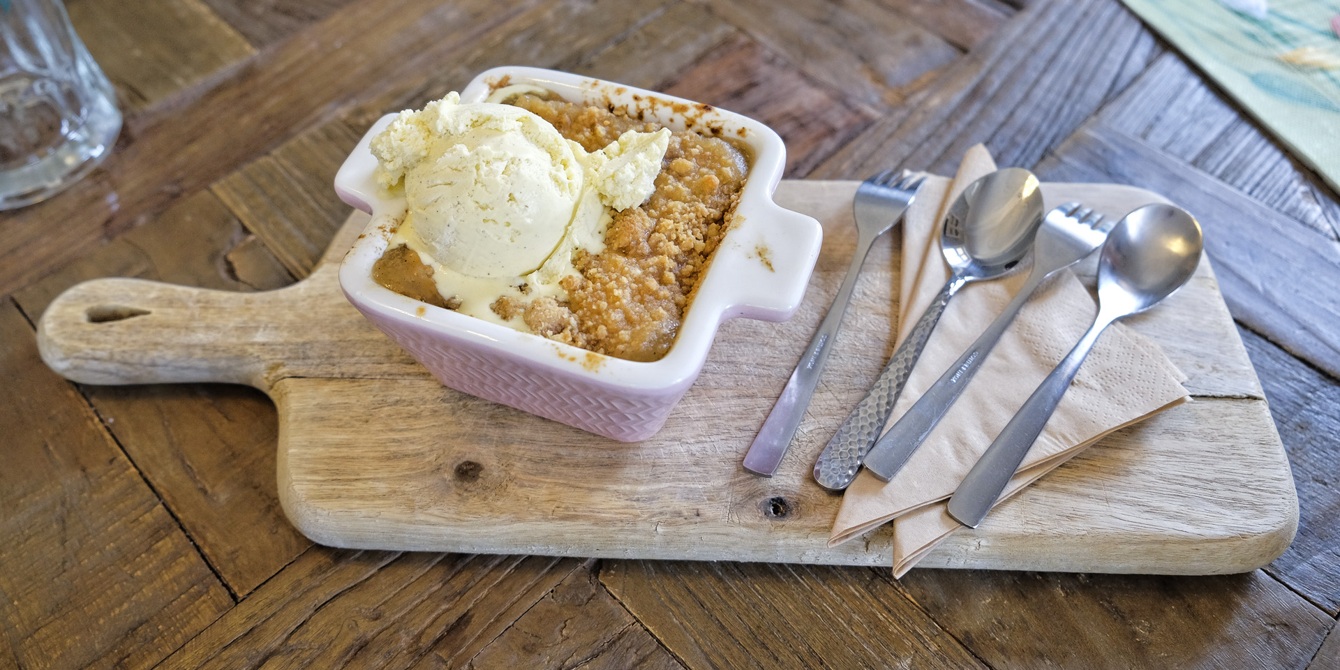 Als Dessert gab es ein warmes Rhabarber Kompott mit Crumble und eine Kugel Vanille Eis. Sehr lecker, die Streusel waren aber schon aufgeweicht. Das Eis hätte man besser separat angerichtet.