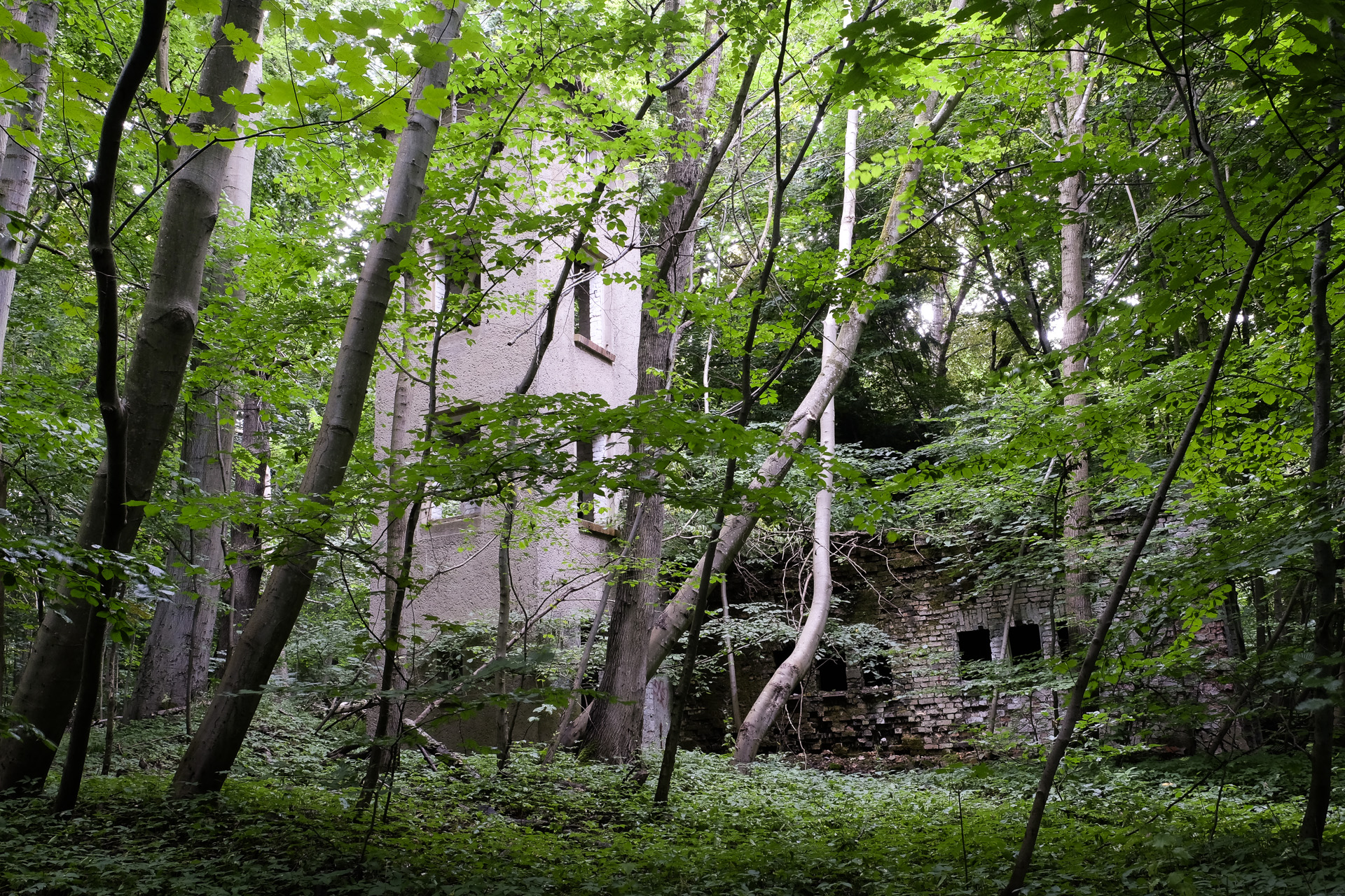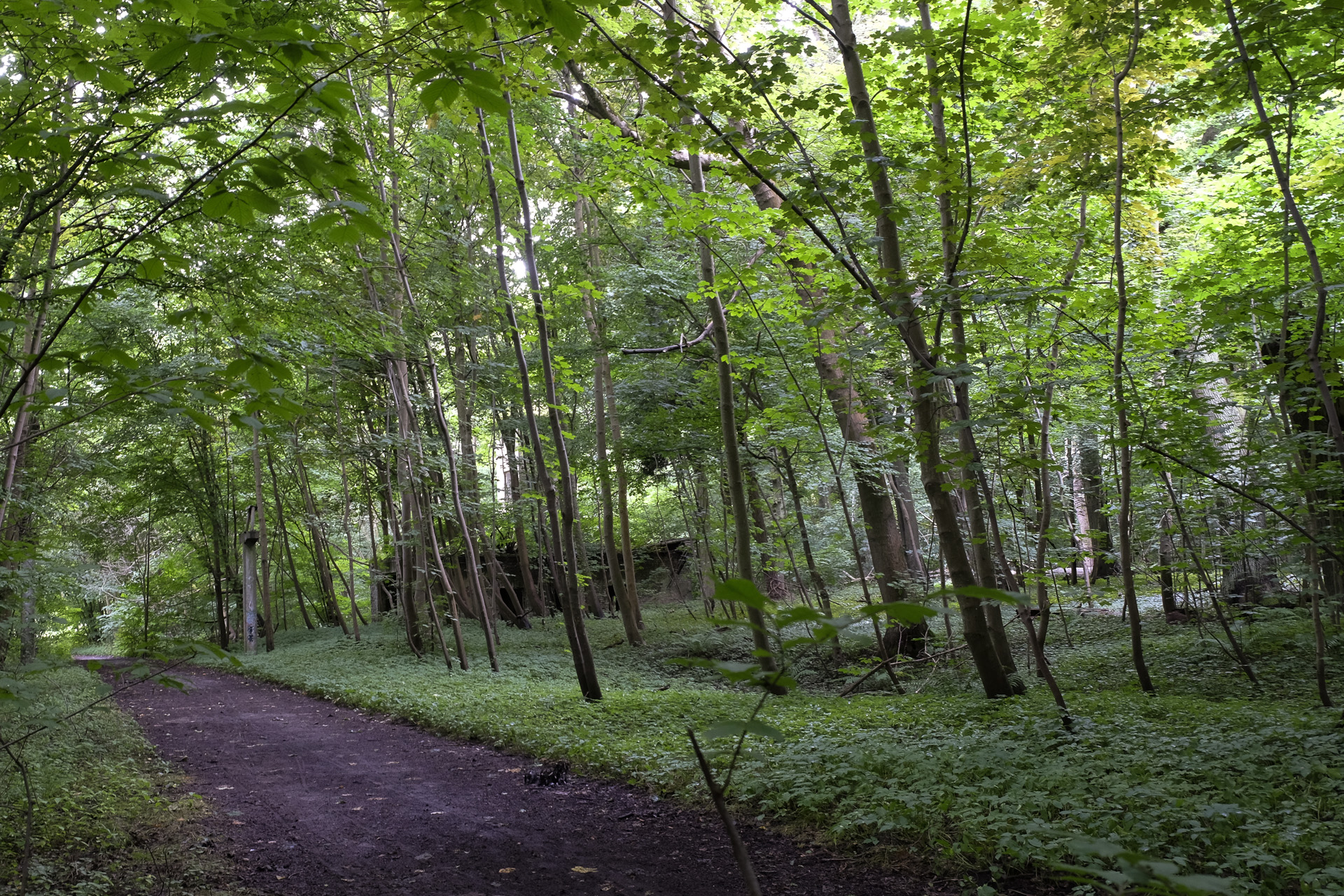 Neben dem Weg tauchen Gebäude im Wald auf.