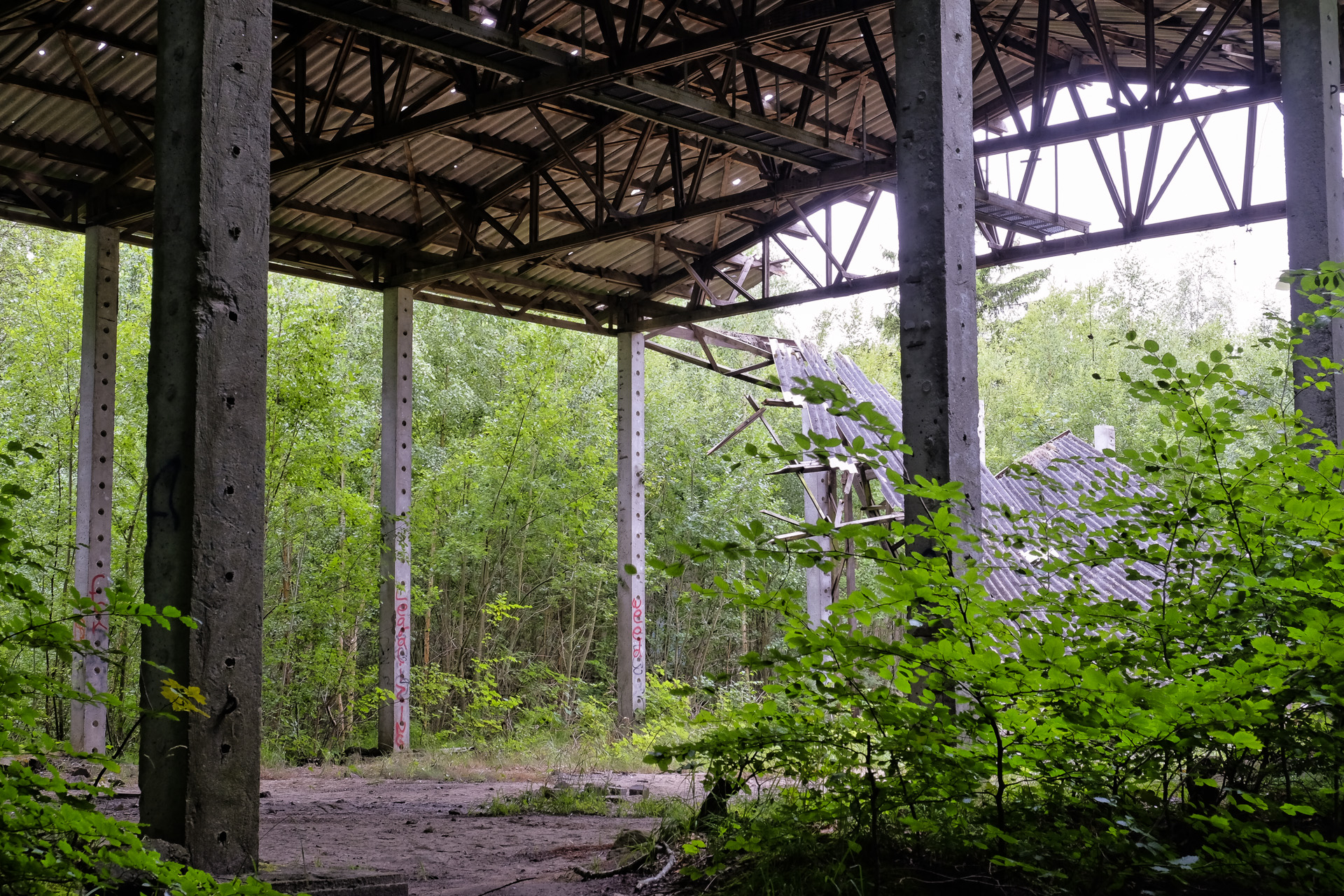 Eine größere Halle rechts vom Weg.