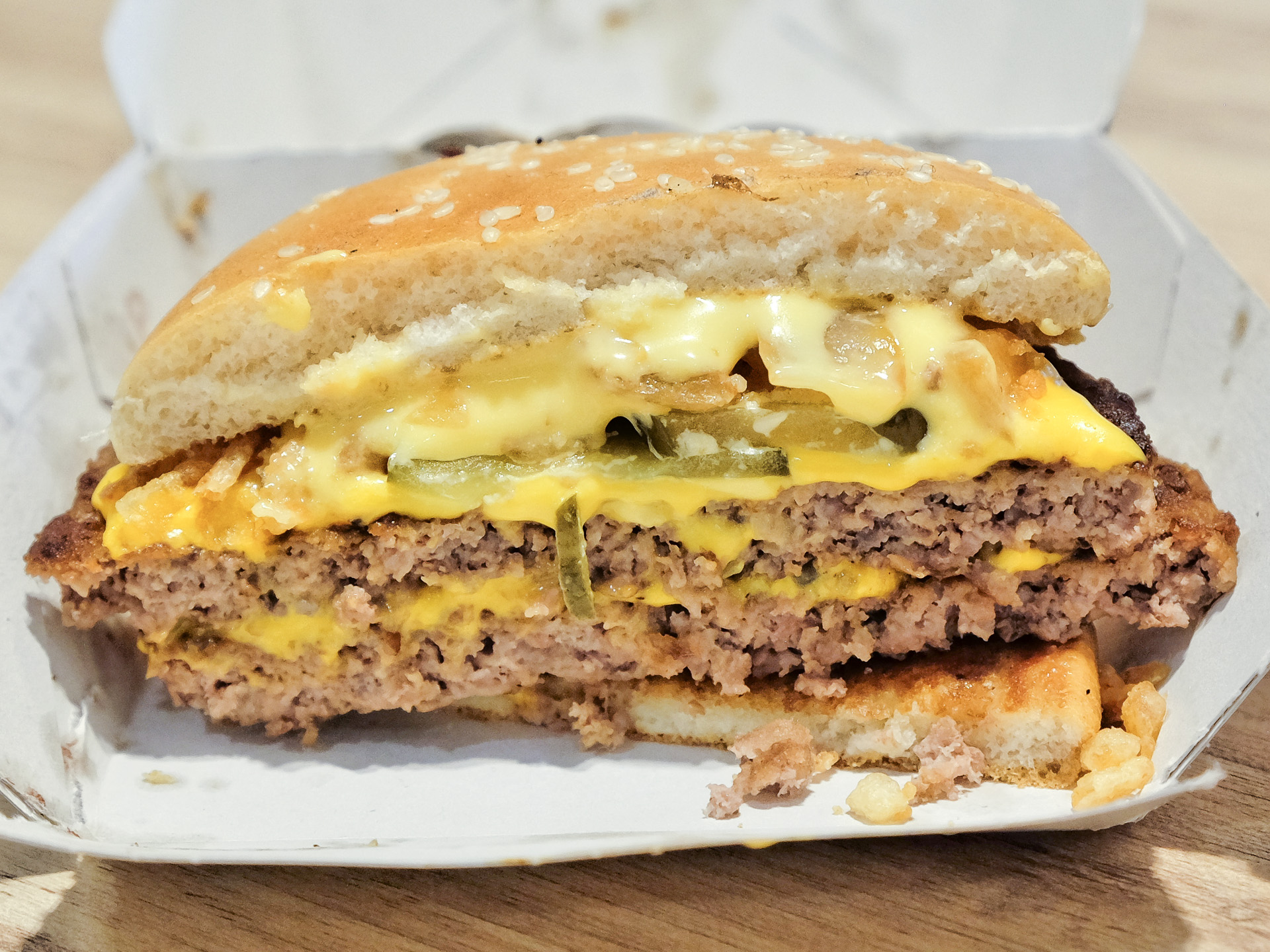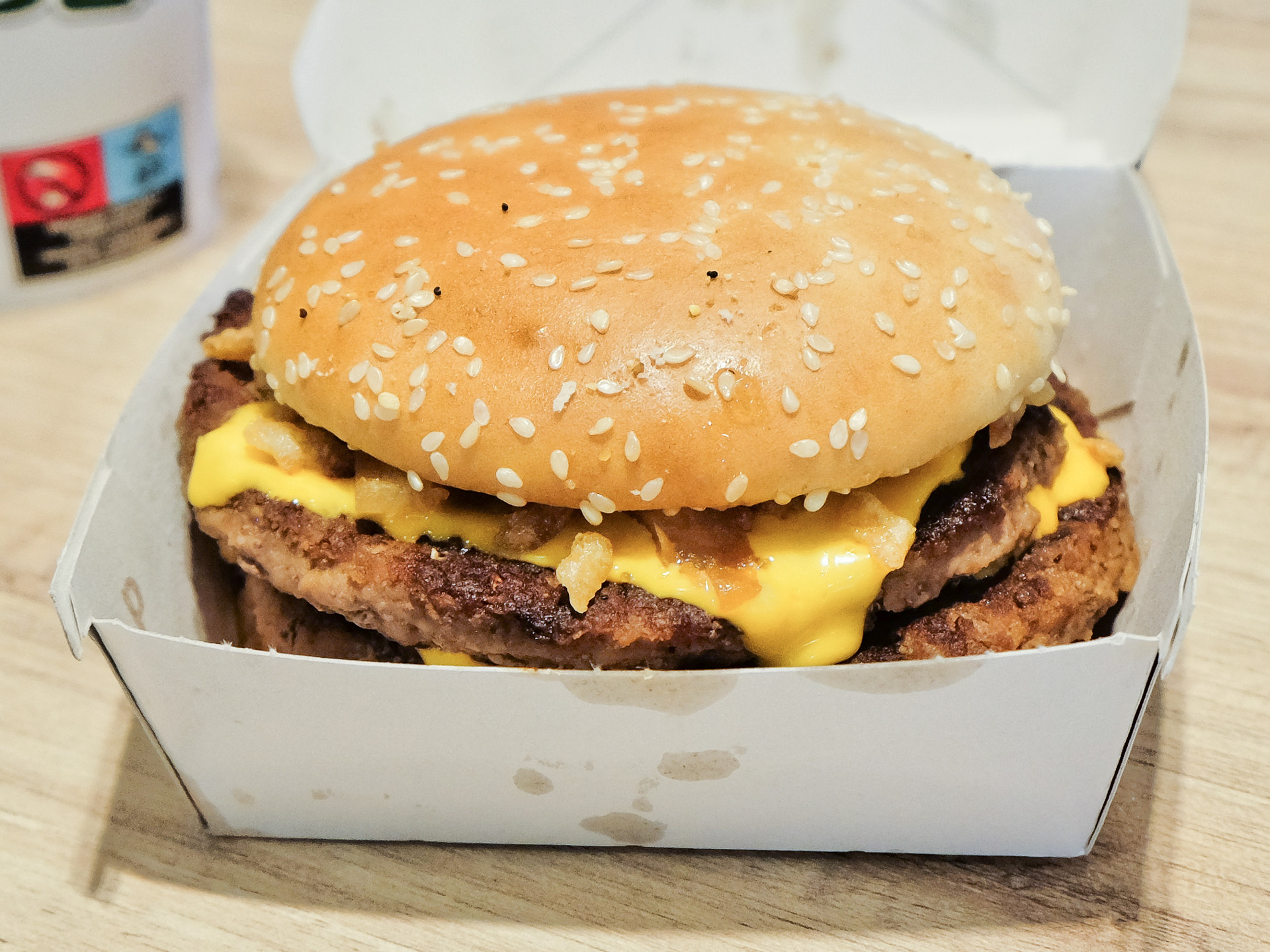Das Sesam Bun war sehr weich, das Patty hätte etwas gröber sein können. Dazu gab es Schmelzkäse, Gewürzgurken, Zwiebeln, Röstzwiebeln und eine Käsesoße. Gerade noch sehr lecker.