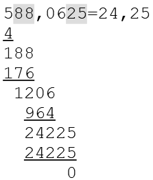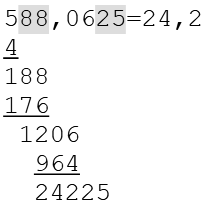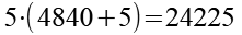 Dies ist hier 5 mal der Fall, die 5 ist daher die nächste Ziffer des Ergebnisses. Jetzt müssen wir den Subtrahend berechnen, die Berechnung erfolgt wieder nach dem gleichen Schema. Die ermittelte Zahl (5) wird zum Teiler (4840) addiert, das Ergebnis wird mit der ermittelten Zahl (5) multipliziert. So erhalten wir 24225.