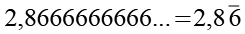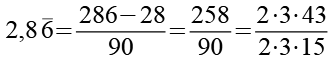 Dieser Lösungsweg läßt sich auch einfacher darstellen. Wir benutzen dazu die Schreibweise bei der die Periode durch einen Überstrich markiert ist. Auf den Bruchstrich schreibt man die komplette Zahl ohne Komma (286). Davon wird die Zahl ohne die Periode (28) abgezogen. Die Länge der Periode beträgt bei diesem Beispiel 1, dafür schreiben wir eine 9 in den Nenner (bei einer Periodenlänge von 3 wäre es dann 999). Unsere Zahl hat hinter dem Komma eine Ziffer (8) die nicht zur Periode gehört, dafür schreiben wir eine 0 in den Nenner.