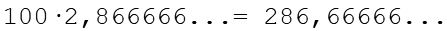 Wir multipßlizieren die Zahl so lange mit 10 bis die Periode auch auf der linken Seite des Kommas steht, bei diesem Beispiel reicht zweimal mit 10 (100).