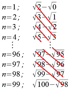 Bis auf 4 Glieder heben sich die Glieder wegen unterschiedlicher Vorzeichen gegenseitig auf.