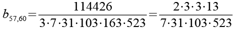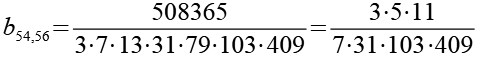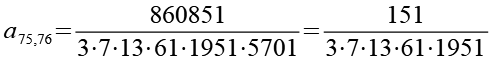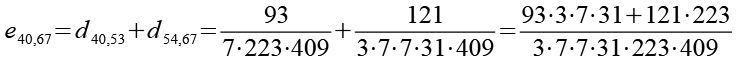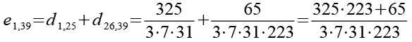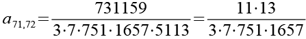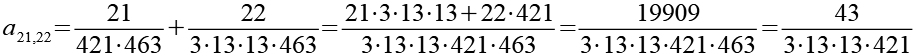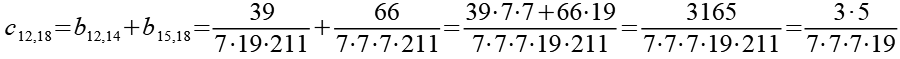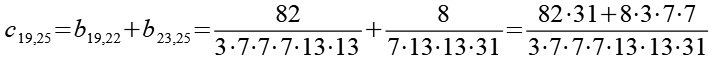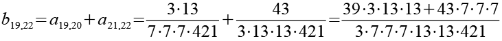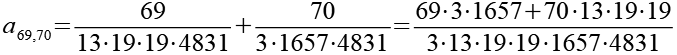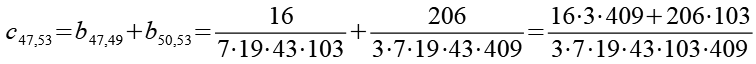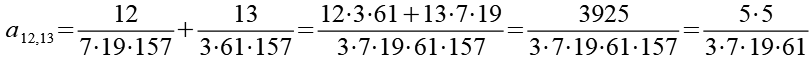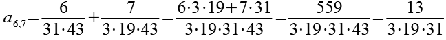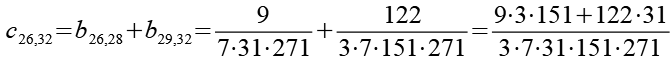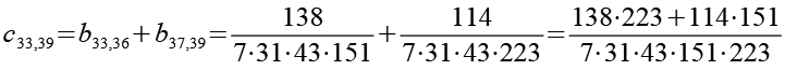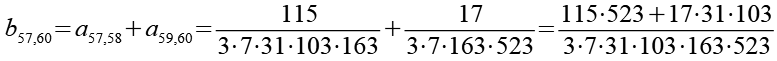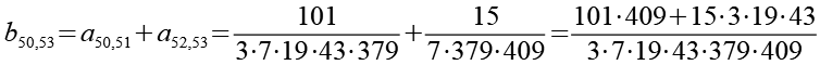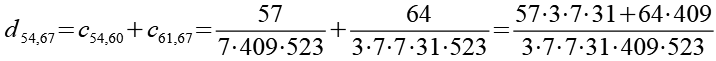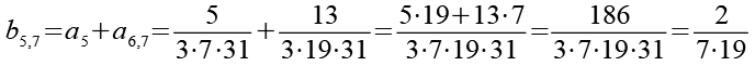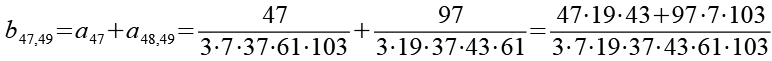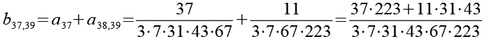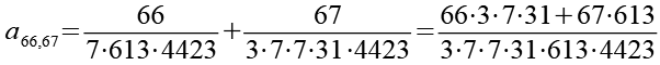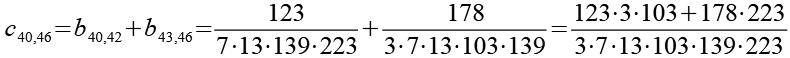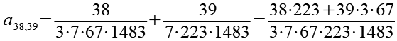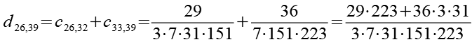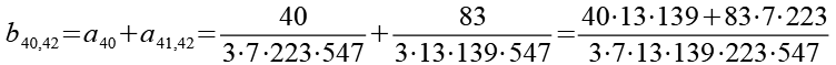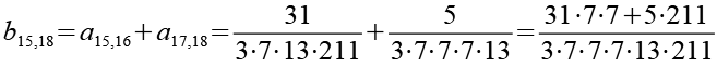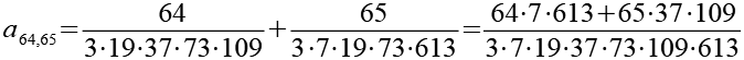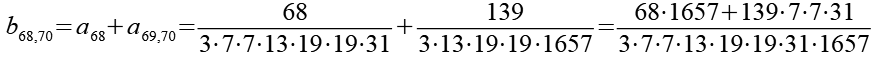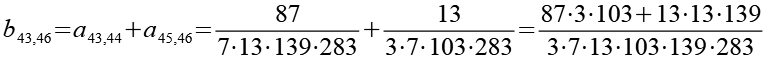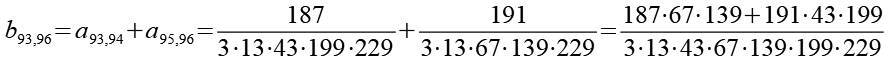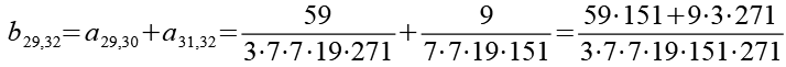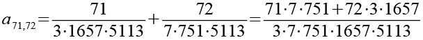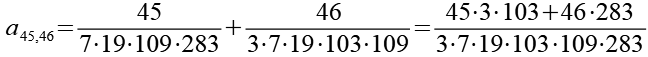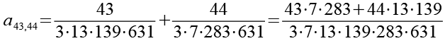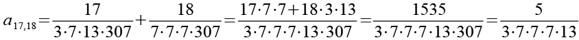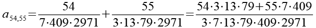 Zur Primfaktorzerlegung siehe Tabelle in Anhang 1. Die Brüche habe ich zuerst paarweise addiert, dabei habe ich möglichst Paare ausgewählt bei denen die größte Primzahl im Nenner gleich ist. Einige Brüche habe ich dabei übersprungen.