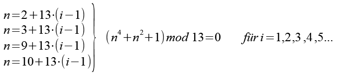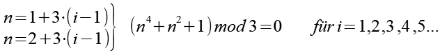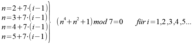Wenn n=4+7*(i-1) ist, dann ist n4+n2+1 durch 7 teilbar.