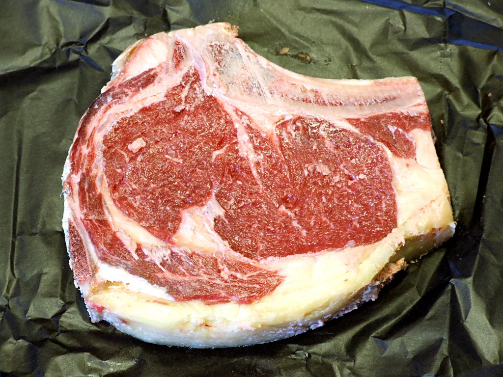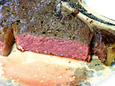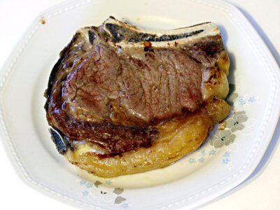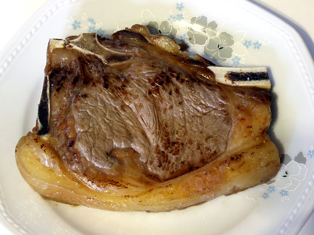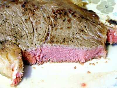 Das Club Steak stammt aus aus dem hinteren Teil der Hochrippe oder aus dem angrenzendem Roastbeef. Diesmal habe ich es mit der Niedrigtemperaturmethode probiert. Nach dem Anbraten auf beiden Seiten kam das Steak in Alufolie gehüllt bei 80 °C in den Ofen. Die Temperatur wurde mit einem Bratenthermometer kontrolliert. Nach 50 min betrug die Kerntemperatur 55 °C.