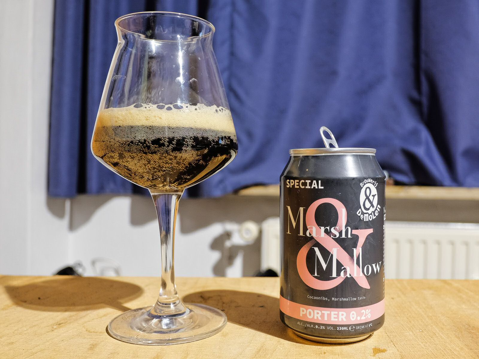 Marsh & Mallow hat eine tiefschwarze Farbe mit rubinroten Nuancen und einer cremigen, hellbraunen Schaumkrone. Das Aroma vereint geröstetes Malz, Kakao und Vanille mit subtilen Marshmallow-Noten. Der Geschmack ist ausgewogen mit Schokolade, mildem Kaffee und Karamell. Ein samtig-weiches Mundgefühl und eine leichte Kohlensäure sorgen für Raffinesse. Der Abgang bleibt mit Noten von Kakao und Vanille erhalten. (Zitat Brouwerij de Molen)