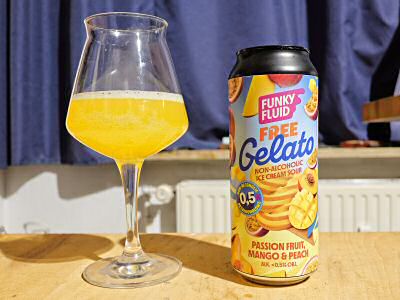 Sweet & sour, heavily fruited non-alcoholic beer inspired by the intense flavor of Italian ice cream and famous dessert from Thailand: Mango Sticky Rice. (Zitat Browar Funky Fluid)