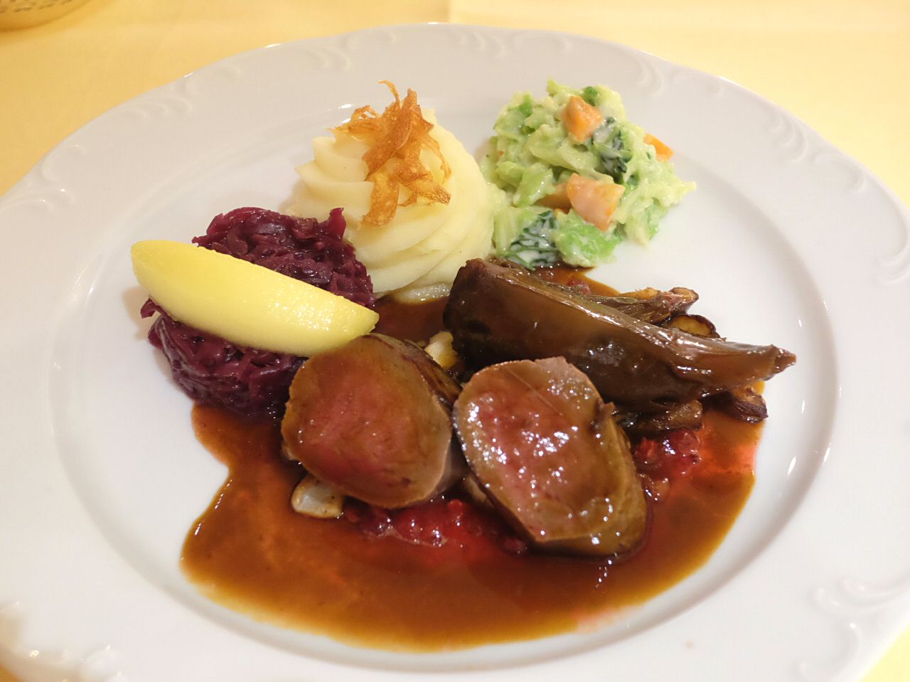 Zweierlei vom Reh (Rücken und Schäufele) auf Shii-Takepilzen mit Sternanisjus, Kartoffel-Selleriepüree, Apfel-Rotkohl
