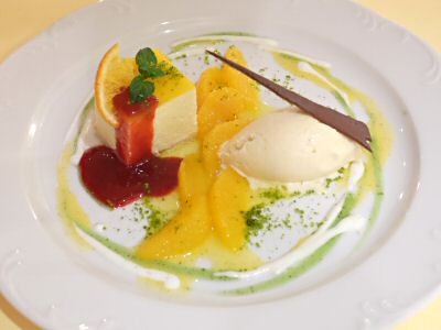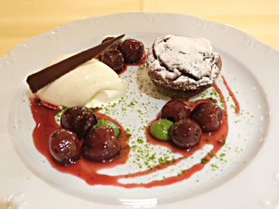 Der Schokoladenkuchen war warm und innen noch etwas flüssig. Dazu gab es in Portwein eingelegte Kirschen, ein Topfen-Eis und eine Pistaziencreme. Sehr lecker.