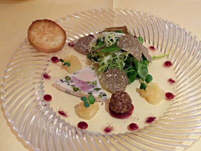 Terrine von Wachtel und Gänseleber und Praline von der Gänseleber im Pumpernickelmantel mit Quittenkompott, kleinem Salat in Nussöl, Herbsttrüffel, Brioche