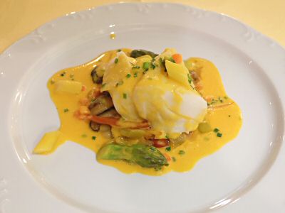 Der Kabeljau war perfekt gegart, sehr zart und leicht glasig. Dazu gab es asiatisches Gemüse (unter anderem Shiitakepilze, Karotten und Paprika) mit rotem Curry (mit Ingwer, Zitronengras und Kokosmilch) und grüner Spargel. Aromatisch und leicht pikant, sehr lecker. Auch hier hatte das Saphir die Nase vorn auch wenn der Garpunkt des Kabeljaus hier besser getroffen wurde. Das Gericht im Saphir bot einfach mehr Abwechslung. 3 : 1 für das Saphir.