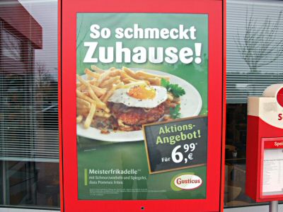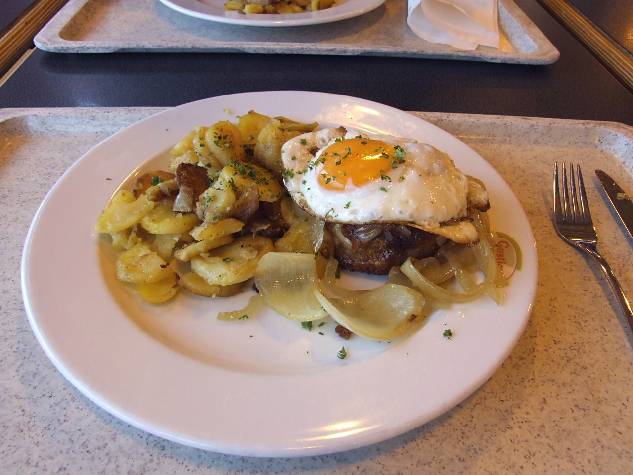 Die Frikadelle war frittiert und hatte eine unangenehm fest pappige Konsistenz, geschmacklich war sie eher neutral. Dazu gab es Bratkartoffeln, die alles andere als knusprig waren, kein Wunder, sie lagen schon eine Weile in der Auslage und geschmorte Zwiebeln. Das Spiegelei war wenigstens frisch. Allenfalls ganz lecker, aber was will man von einer Imbißkette auch erwarten.