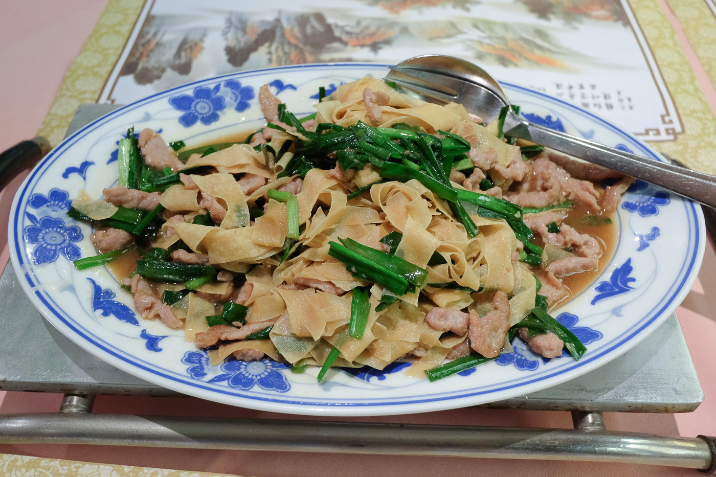 Das Schweinefleisch war in dünne Streifen geschnitten und zart, dazu gab es knackigen Schnittknoblauch und dünne feste Tofublätter. Diese Art Tofu hatte ich noch nicht gegessen. Ganz lecker, das Gericht wirkte fast ungewürzt.