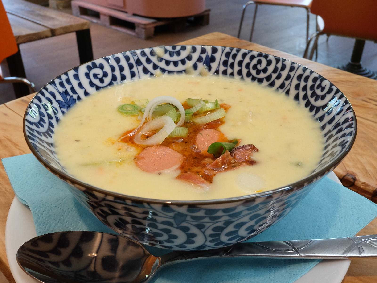 Die Kartoffelsuppe hatte eine sämig cremige Konsistenz und enthielt noch ein paar gröbere Kartoffelstücke, sie hatte ein feines Aroma. Dazu gab es etwas geräucherten Speck, Würstchenscheiben und Lauchzwiebel. Aromatisch und sehr lecker.