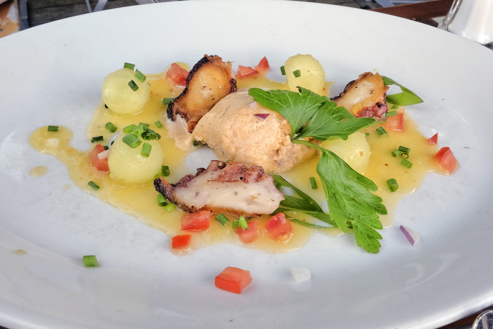 Der gebratene Pulpo hatte eine feine Kruste mit schönen Röstaromen und ein feines Aroma. Dazu gab es ein aromatisches Hummer Mousse mit leichter Schärfe und süß saurer Melone. Sehr lecker.