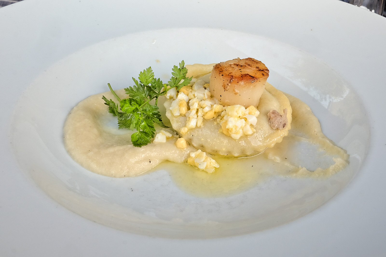 Kalbshaxenraviolo und Jakobsmuschel mit Blumenkohlpüree und gehacktem Ei