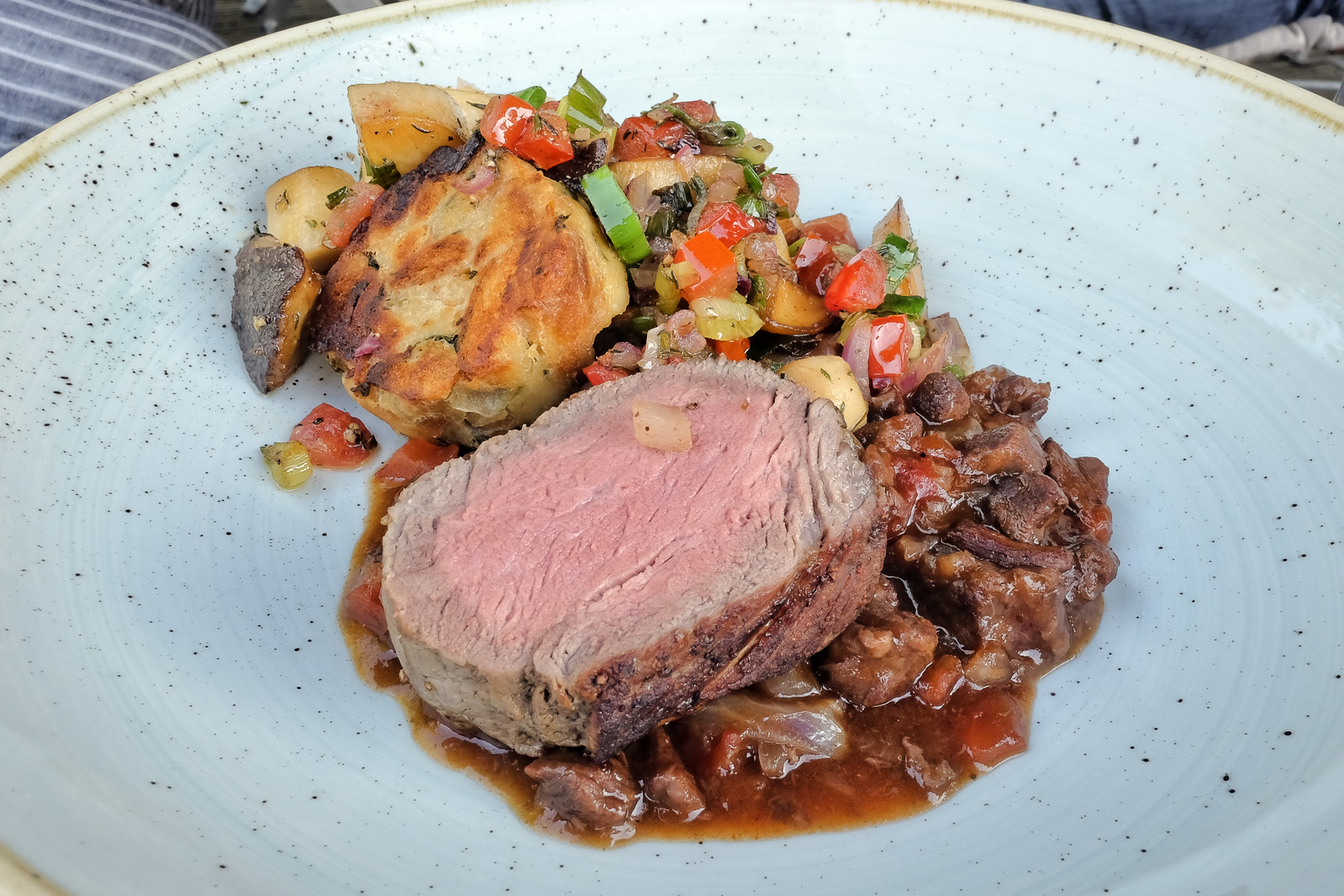 Der rosa gebratene Rinderrücken war wunderbar zart und hatte ein feines Aroma. Dazu gab es Kräuterseitlinge, Serviettenknödel und ein Rindersugo. Das Rindersugo mit kleinen Rindfleischstücken, Zwiebeln und Gemüse war schön aromatisch, die Serviettenknödel hätten etwas lockerer sein können. Sehr lecker.