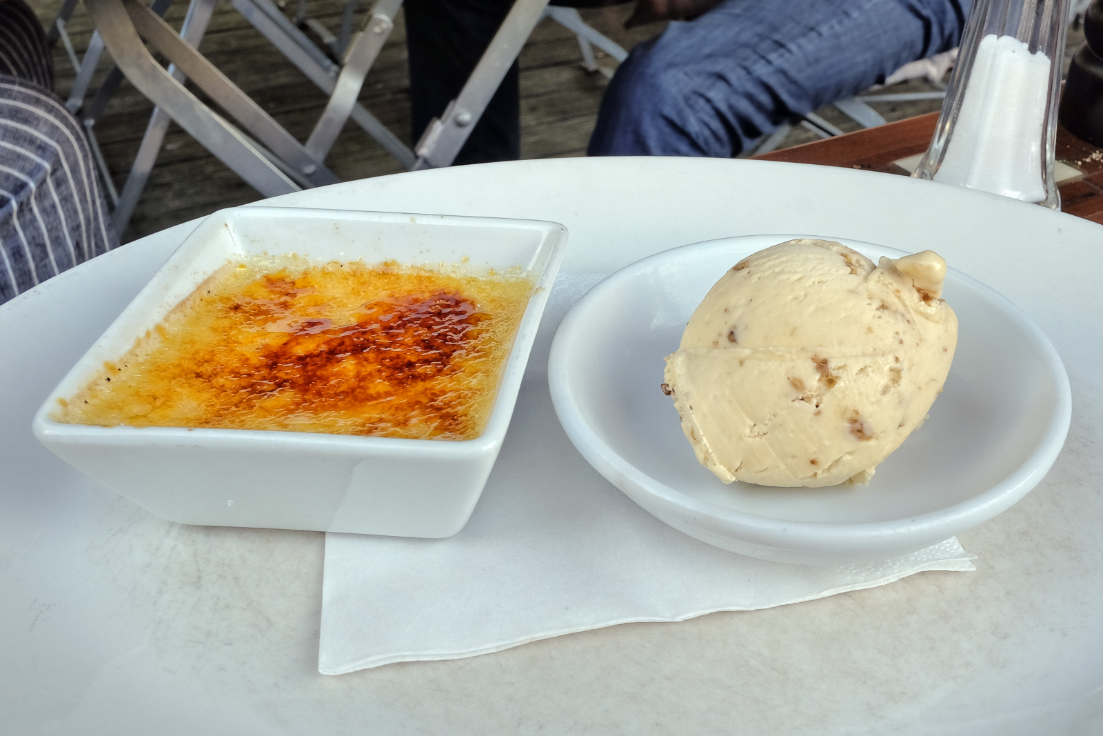 Die Creme Brulee hatte eine zarte Textur und ein feines Aroma, die Zuckerkruste war schön kross. Dazu gab es ein cremiges Schokoladen Mandel Eis mit feinem Aroma. Sehr lecker.