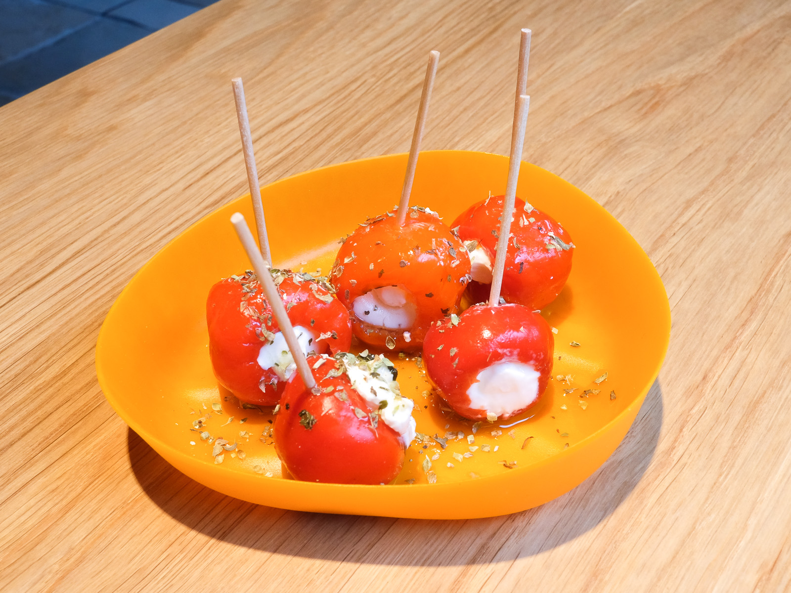 Die Paprika waren sauer eingelegt, knackig und hatten eine pikante Schärfe, gefüllt waren sie mit zartem Frischkäse. Bestreut waren sie mit etwas Oregano. Sehr lecker.