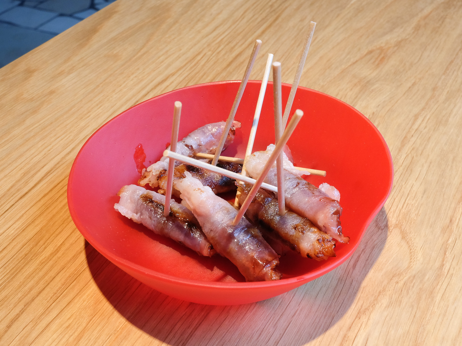 Die kleinen Dattelstücke waren mit Speck umwickelt. Sehr lecker, der Speck hätte aber etwas krosser und aromatischer sein können.