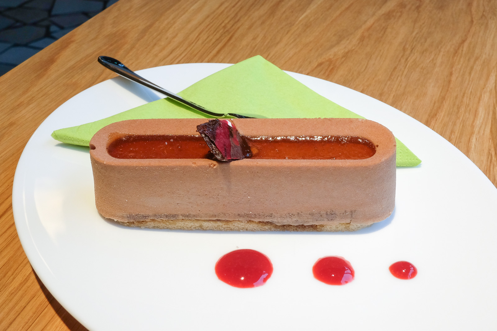 Die Schokoladenschnitte bestand aus einem lockeren Schokoladeschaum, er hatte ein etwas merkwürdiges Aroma (metallisch säuerlich), ganz lecker.