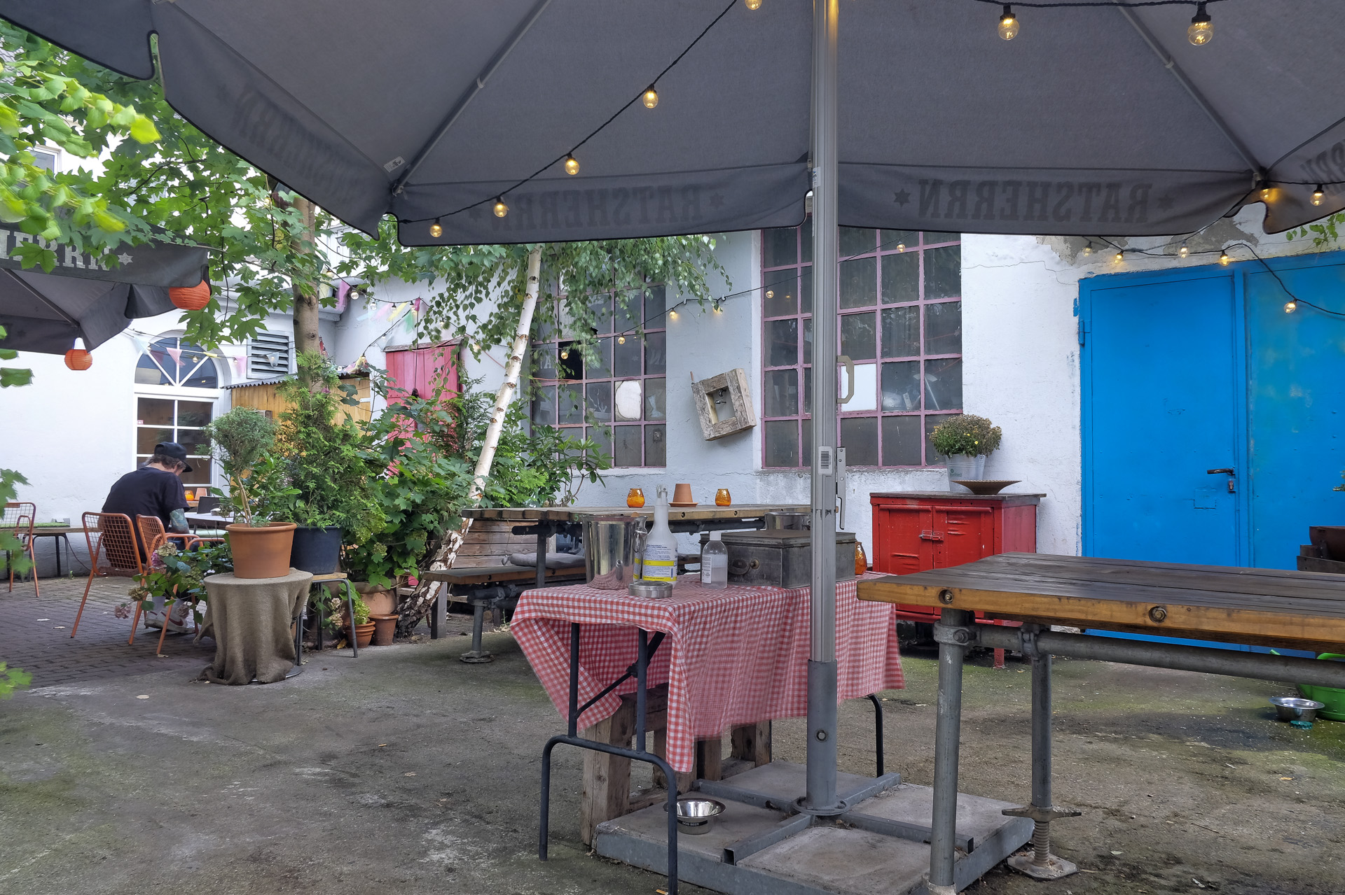 Der "Garten" hat ein bischen das Flair eines Schrottplatzes mit Möbeln vom Sperrmüll.
