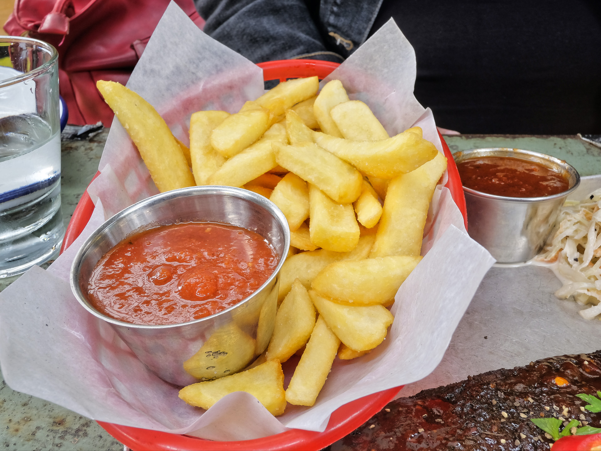 Pommes mit Schale frittiert und mit Brooklyn Burger Bars Ketchup oder Mayo serviert.