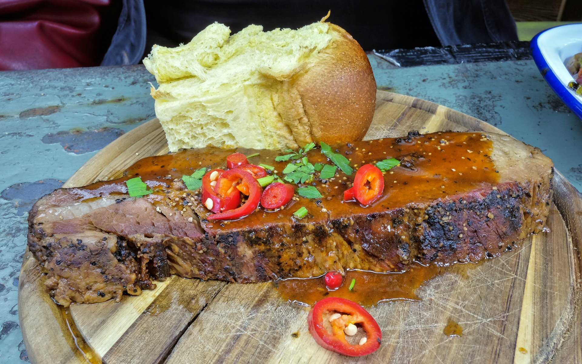 Das Beef Brisket vom Black Angus wurde 17 Stunden im Smoker gegart, es war zart und saftig und hatte ein feines Aroma. Dazu gab es ein Stück Weißbrot, Gravy und scharfe Chilis. Sehr lecker.