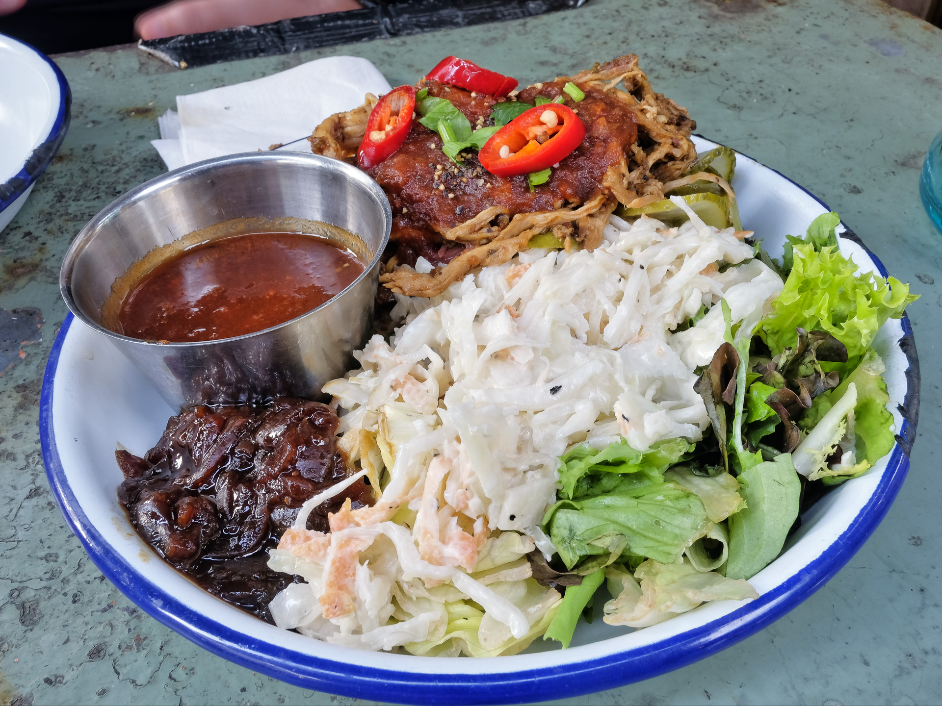 Das Pulled Pork wurde 14 Stunden im Smoker gegart, dafür war es aber etwas faserig und trocken. Dazu gab es etwas Salat, Coleslaw, geschmorte Zwiebeln und einen BBQ Dip. Gerade noch sehr lecker, das Pulled Pork bei Dulf’s Burger hat mir deutlich besser gefallen.