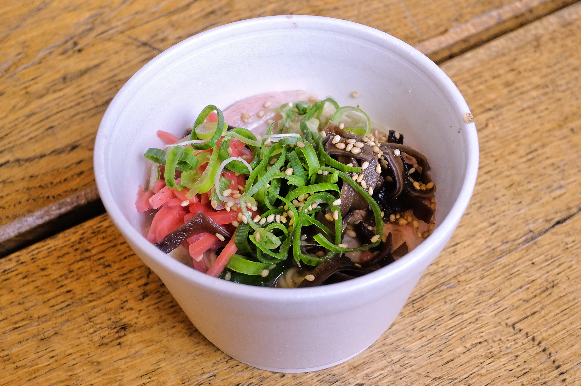 Die Ramen wurde aus einer Schweine Brühe zubereitet. Sie enthielt Nudeln, chinesische Pilze (?), Lauchzwiebeln, sehr zartes Schweinefleisch, eingelegten Ingwer und etwas Sesam. Sehr lecker.