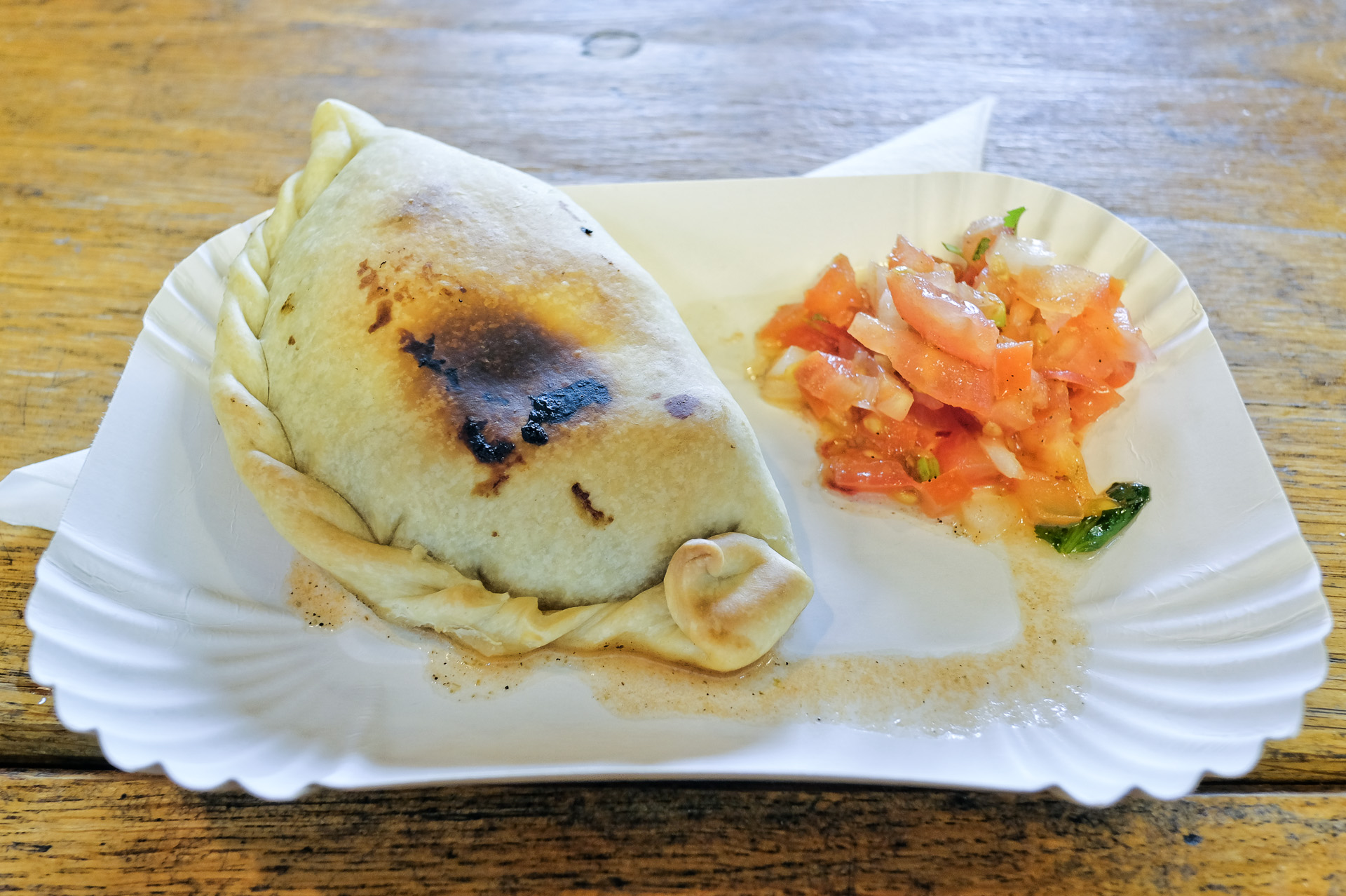 Die Empanada war mit Rinder Hack, Oliven und Ei gefüllt, sie war aromatisch gewürzt mit feinem Olivenaroma und dezenter Schärfe. Dazu gab es noch etwas Tomaten Salat. Sehr lecker.