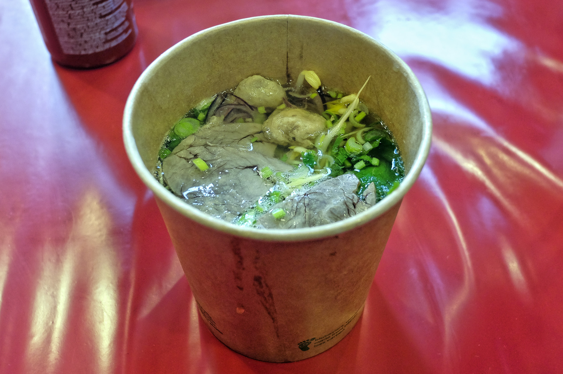 Die Pho enthielt Reisnudeln, zartes Rindfleisch, Klößchen (Bo Vien), Zwiebeln, Lauchzwiebeln, Sojasprossen, etwas Ingwer und Kräuter (u.a. Koriander). Sie hatte ein feines Aroma, sehr lecker, Klasse.