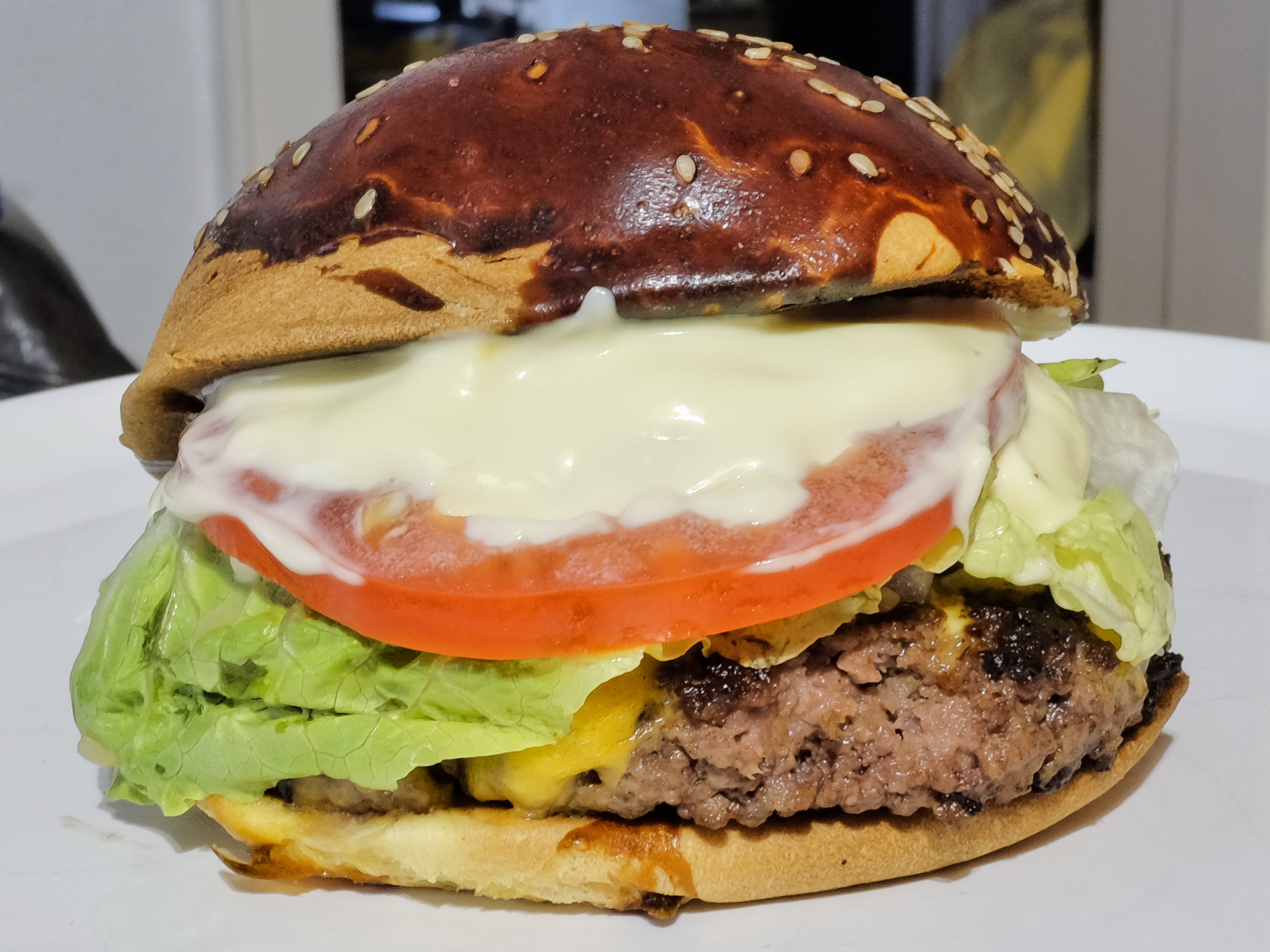mit 200g zwei Wochen trockengereiftem Rindfleisch, mit Cheddar