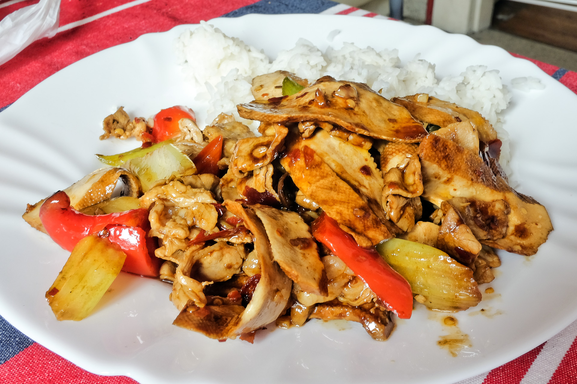 Der Doufu Gan (getrockneter leicht geräucherter Tofu) hatte eine sehr angenehme, leicht feste Konsistenz. Dazu gab dünn geschnittenes zartes Schweinefleisch, rote und grüne Paprika und Staudensellerie. Das Gericht war mit Chilis und schwarzen fermentierten Sojabohnen (Douchi) gewürzt. Aromatisch und pikant, sehr lecker.