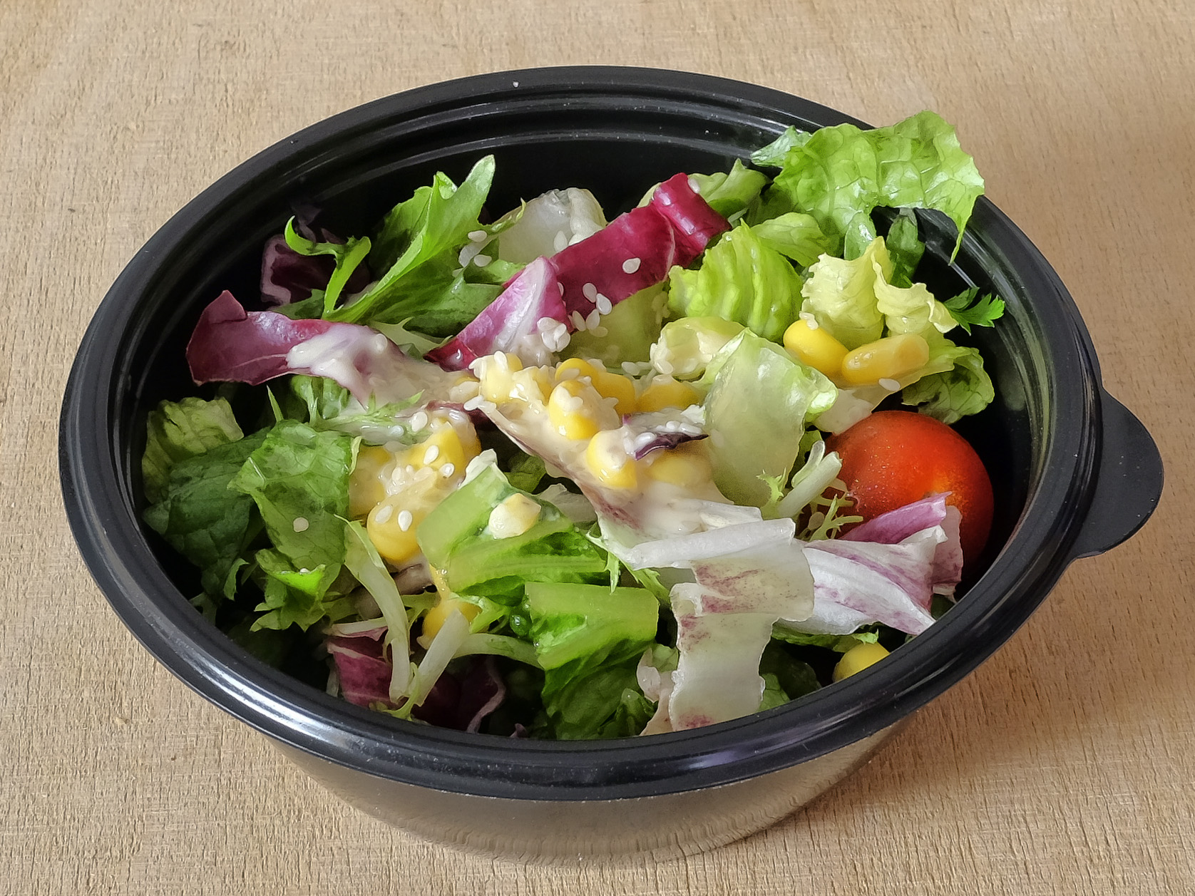 Der Salat enthielt Lollo bionda, Radicchio, Eisbergsalat, Tomate, Maiskörner, Petersilie, etwas Sesam und ein aromatisches Senf Dressing, sehr lecker.