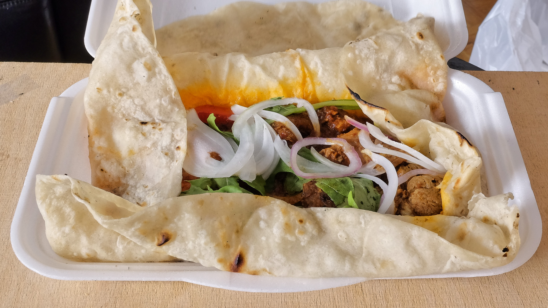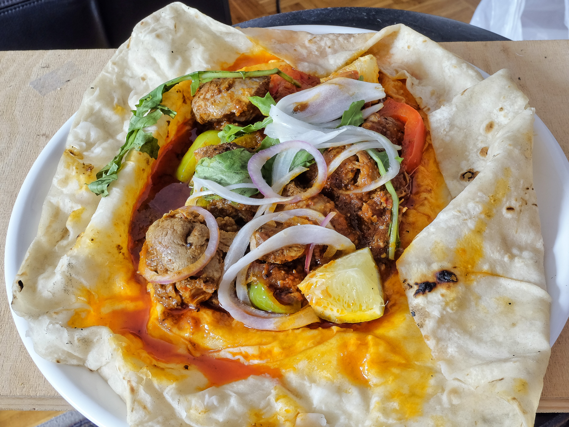 Das Gericht war auf einem Fladenbrot angerichtet. Das geschmorte Lammfleisch war zart und aromatisch. Dazu gab es Zwiebeln, Paprika und Tomaten, gewürzt mit Knoblauch und schwarzem Pfeffer. Aromatisch und sehr lecker.