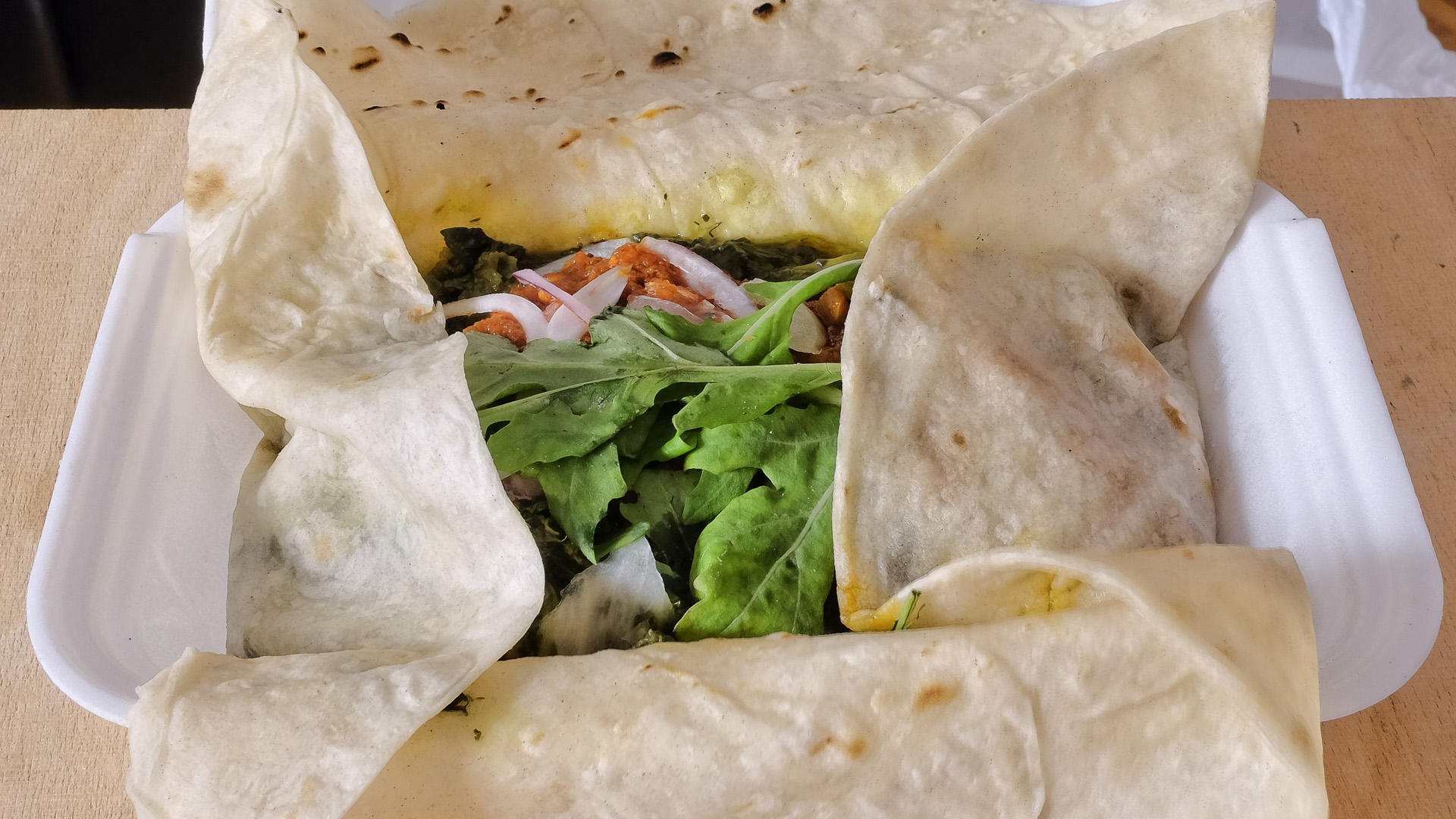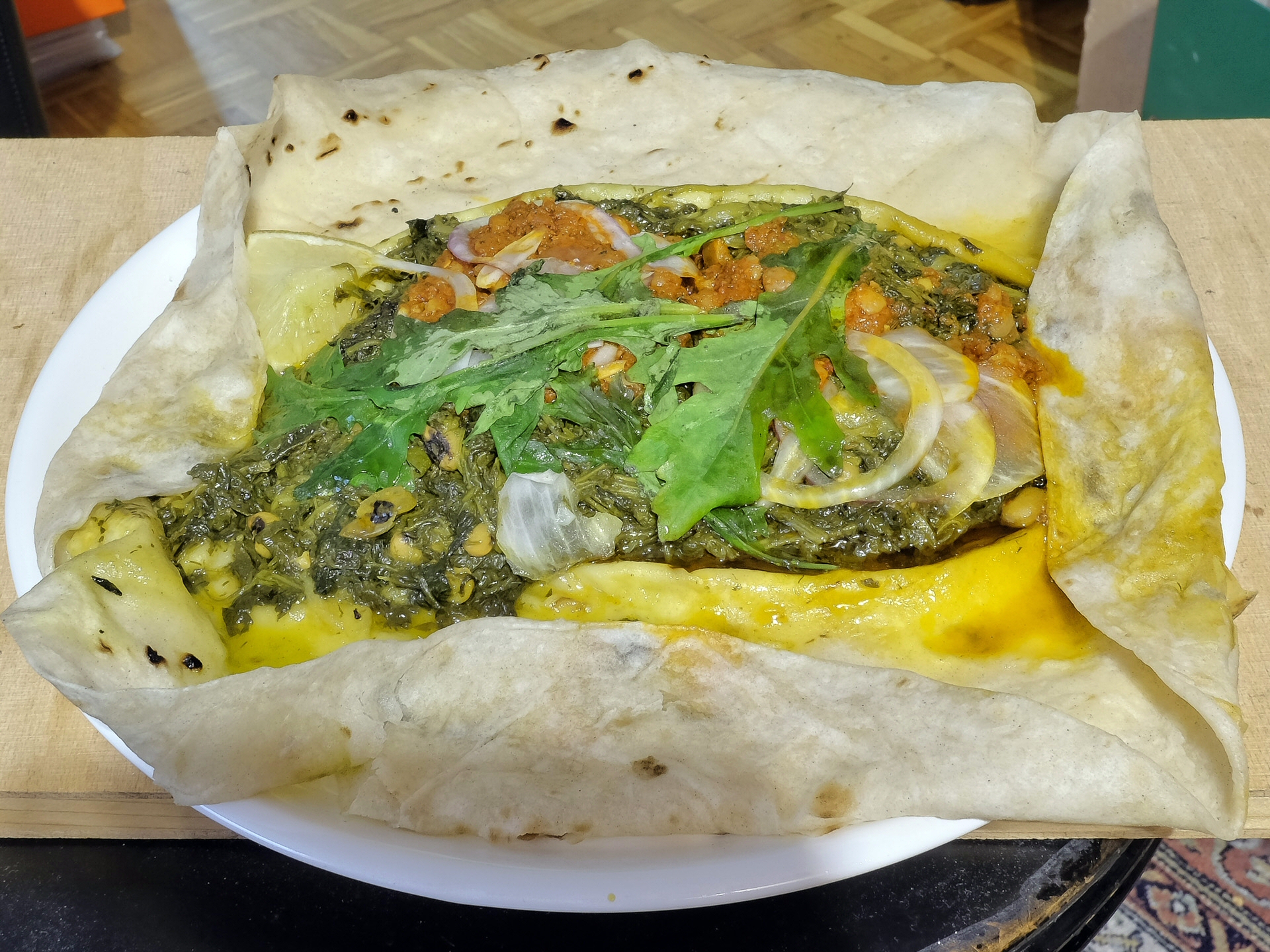 Das Gericht war auf einem Fladenbrot angerichtet. Es bestand aus Spinat, Porree, weißen Bohnen (2 verschiedene Sorten) und Gewürzen. Der Spinat war zart und die Bohnen leicht al dente. Das Gericht hatte ein feines Aroma mit leichter Zitrusnote, sehr lecker.