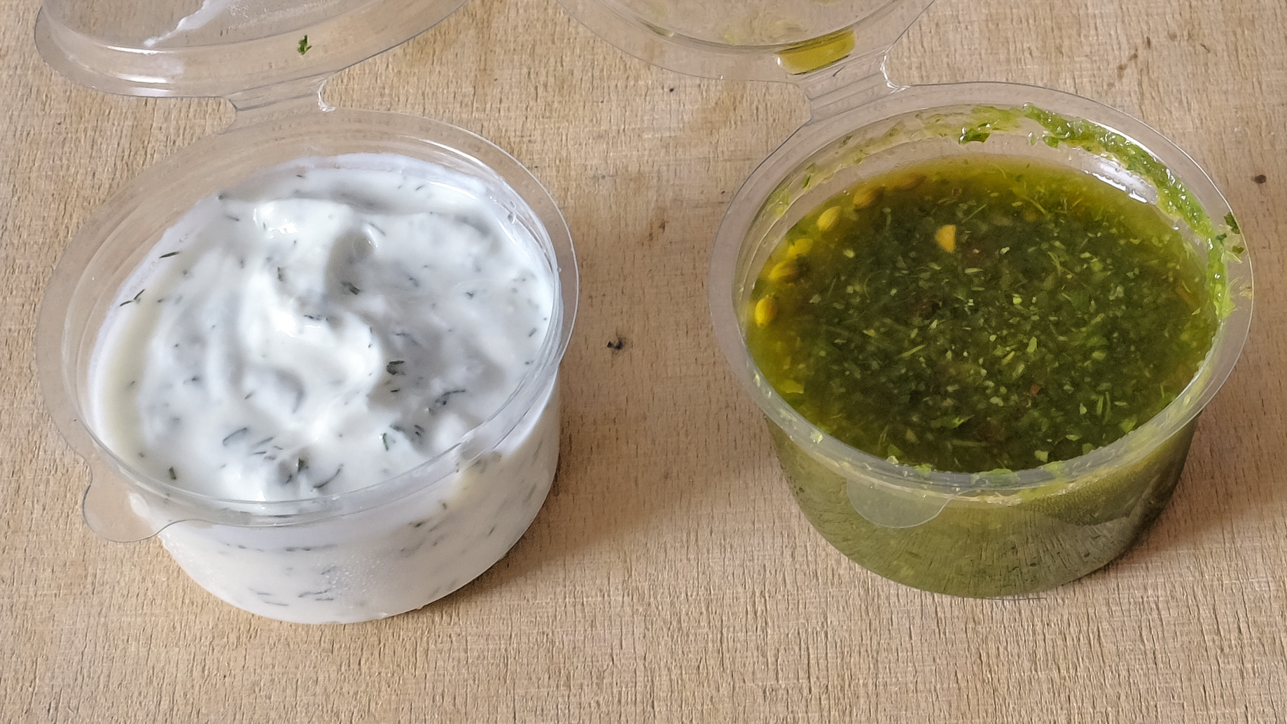 Dazu gab es einen dezent gewürzten Yoghurt Dip, (sehr lecker) und ein grünes säuerlich pikantes Chutney (sehr lecker).