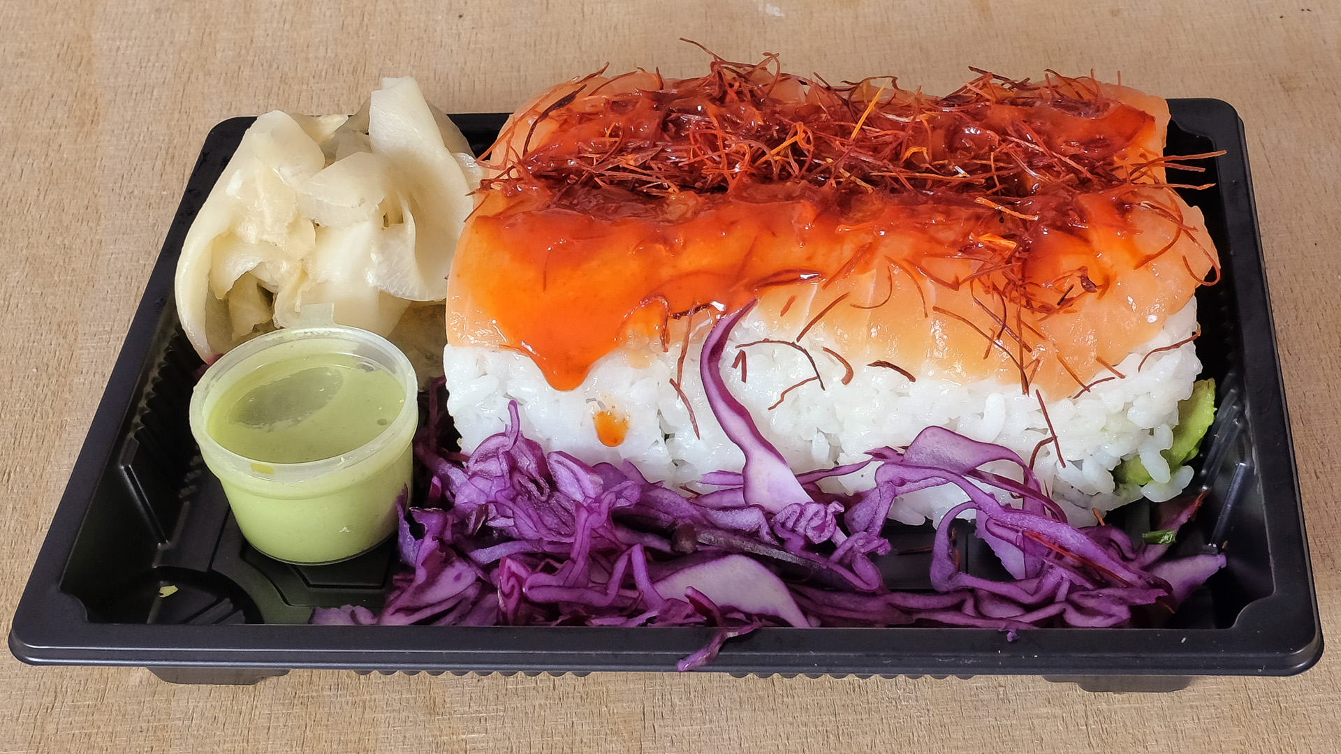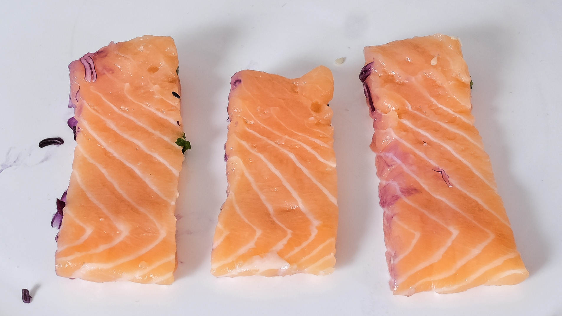 Der Lachs war in sehr große unregelmäßige Stücke geschnitten, er war sehr weich aber hatte keine angenehme Textur und wenig Aroma. Gerade noch sehr lecker.