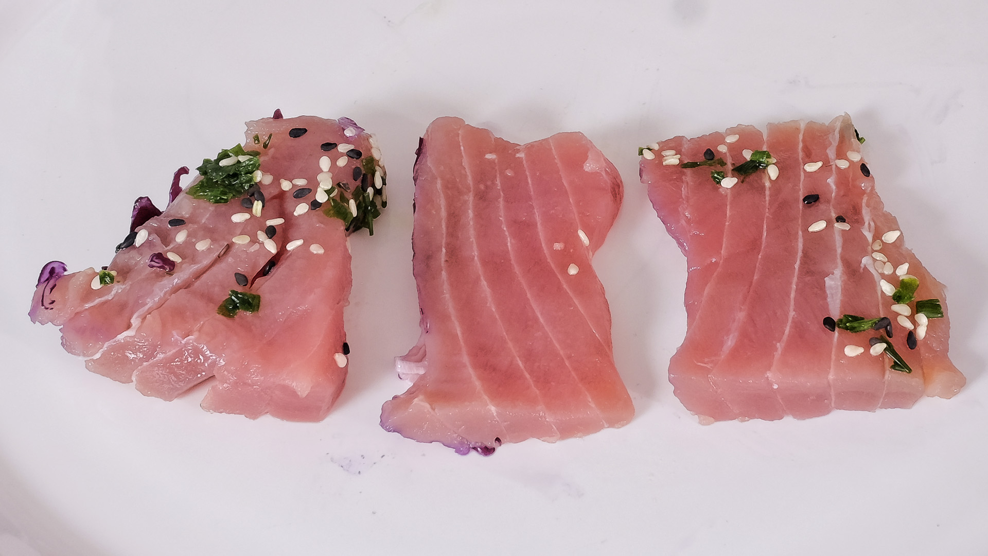 Der Thunfisch war in große unregelmäßige Stücke geschnitten, er war sehr weich und sehnig und etwas metallisch. Ganz lecker.