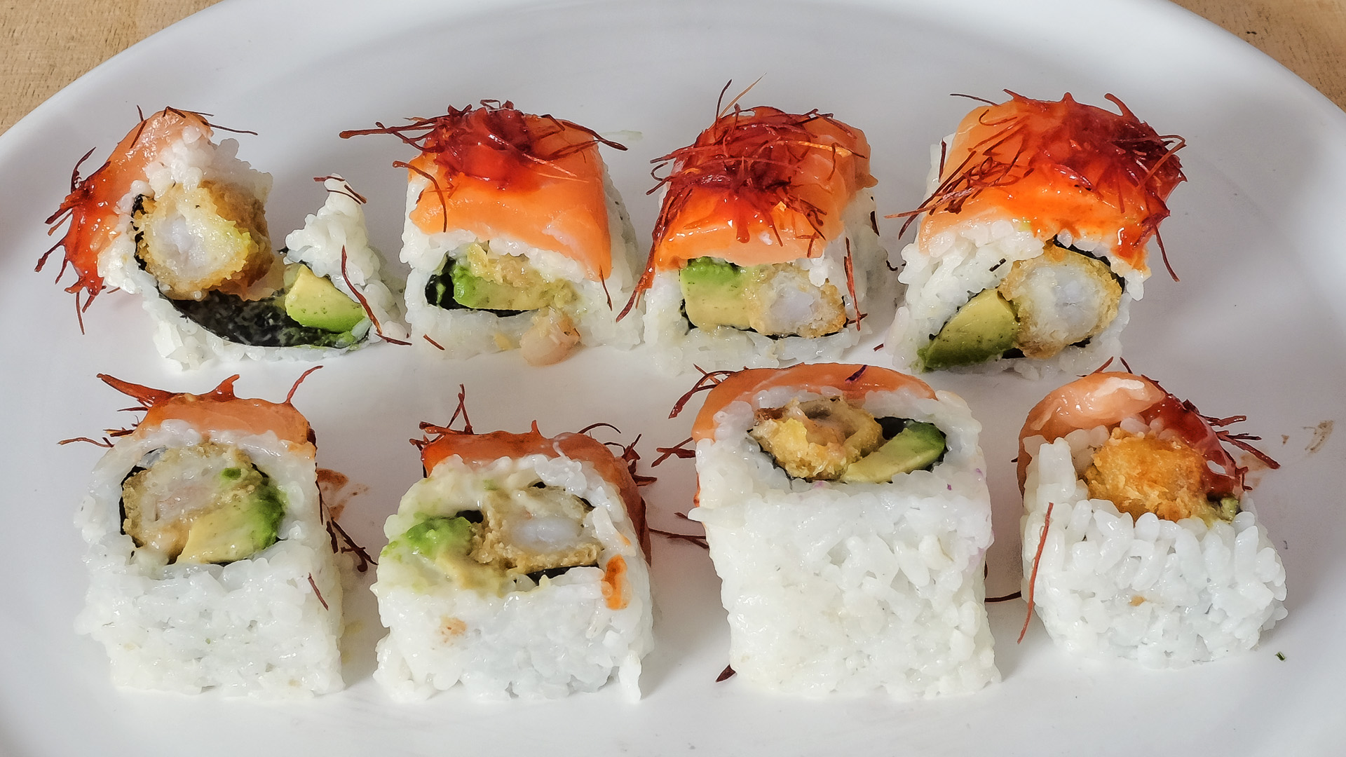 mit einer gebackenen Garnele, Avocado und Sweet-Chili-Sauce umhüllt mit Lachs, scharfe Sauce und Chilifäden